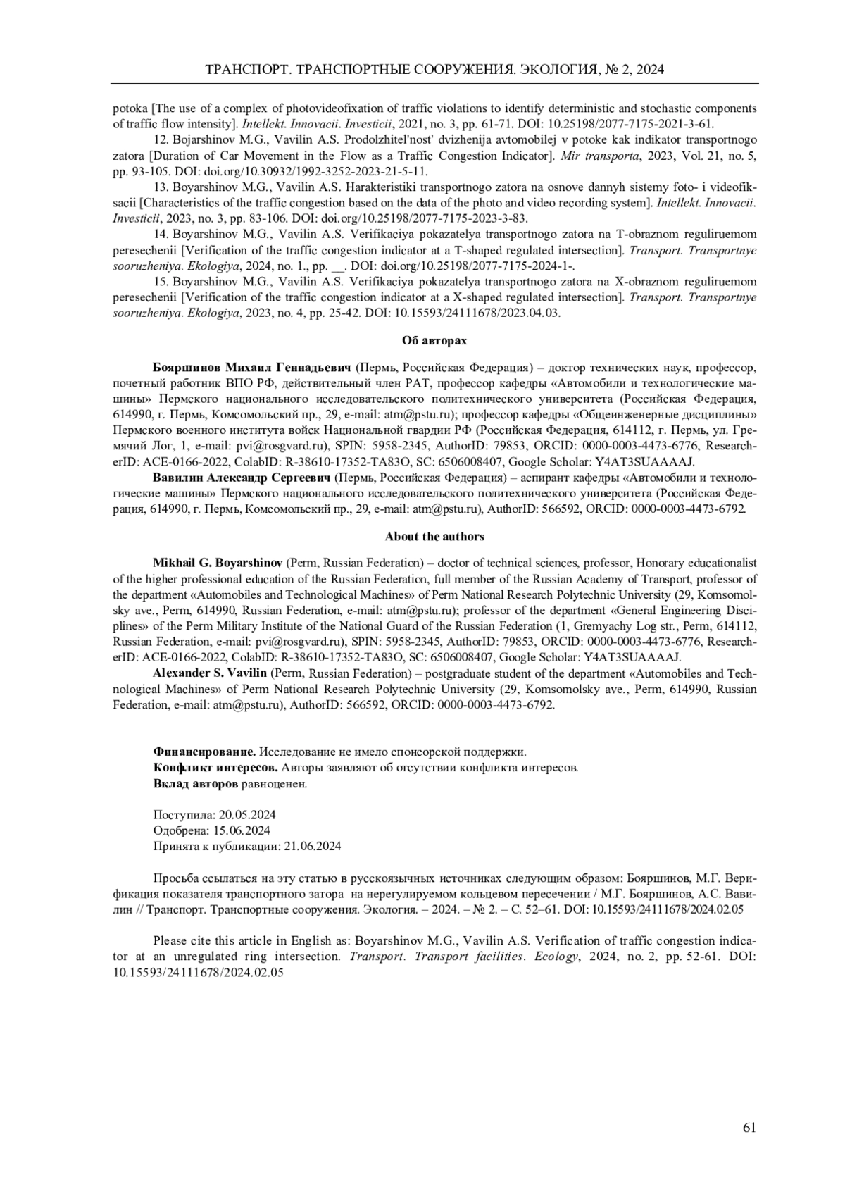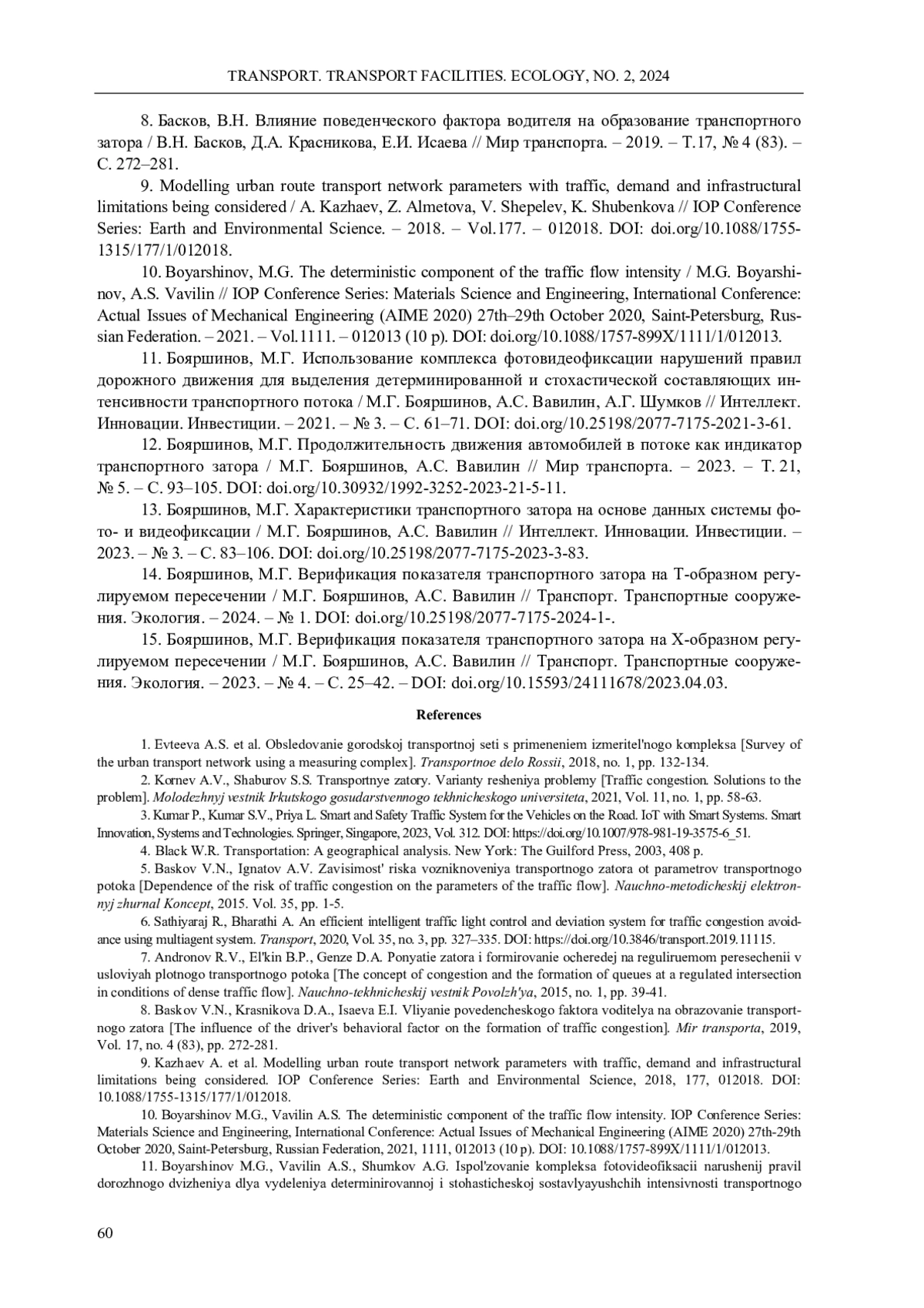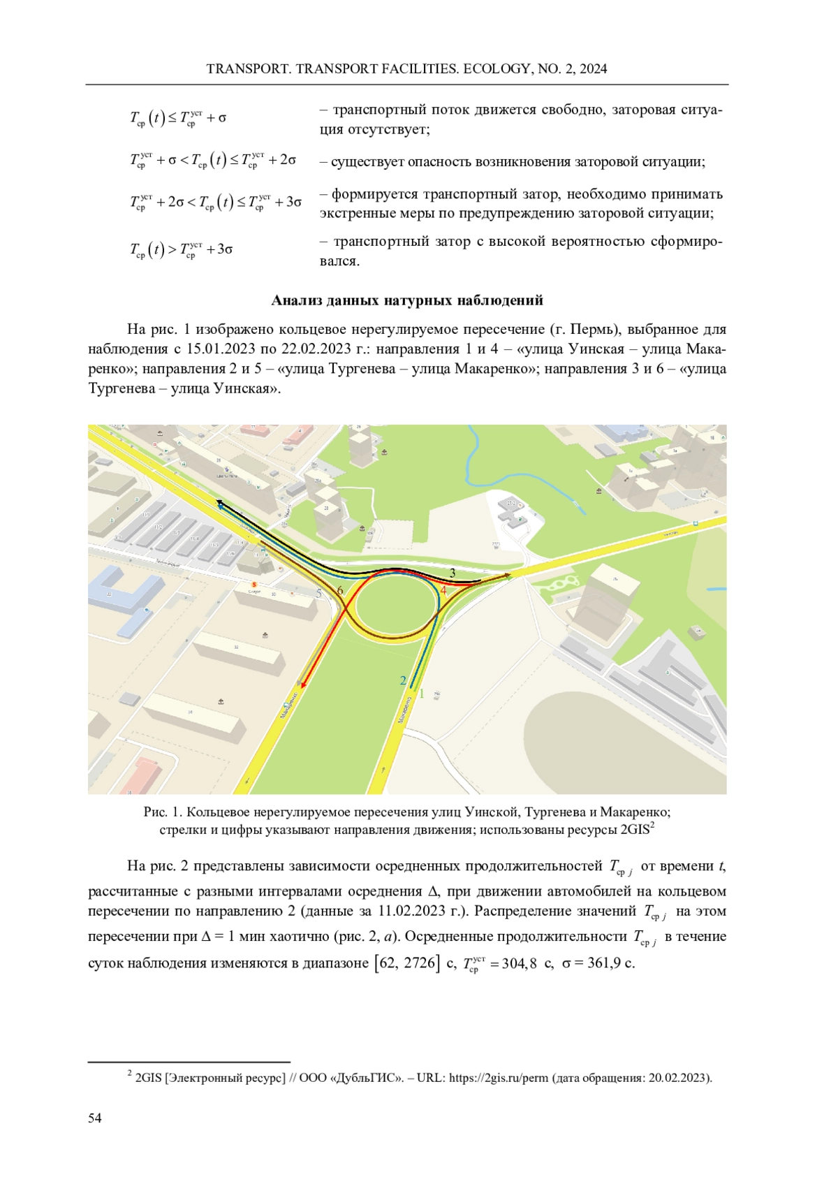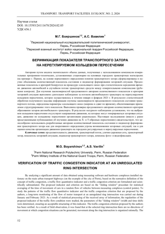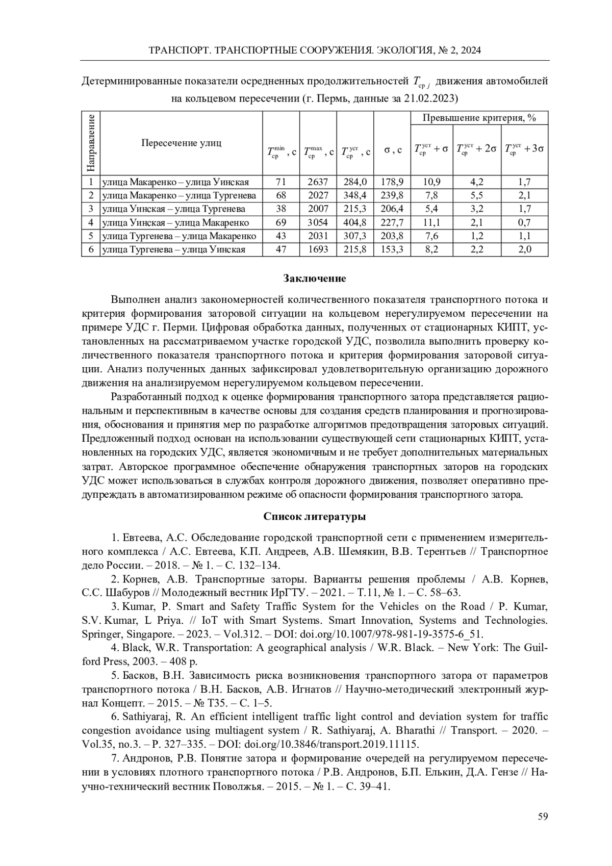 Авторами путем анализа значительного объема данных, полученных с использованием комплексов измерительных программно-технических, установленных стационарно на основных городских транспортных магистралях (на примере г. Перми), на основе нормативного определения понятия транспортного затора сформулированы и научно обоснованы количественный показатель состояния и индикатор формирования заторовой ситуации. Предложенные показатель и критерий базируется на процедуре «скользящего окна» при статистическом осреднении времени движения автомобилей в случайном потоке транспортных средств между измерительными комплексами (рубежами контроля). Для изучения закономерностей предложенного авторами количественного показателя и критерия заторовой ситуации выполнено длительное наблюдение за потоком автомобильного транспорта на нерегулируемом кольцевом пересечении, которое осуществлялось в течение января и февраля 2023 г. В результате статистической обработки полученного массива информации изучены закономерности предложенного показателя состояния транспортного потока, определены параметры «скользящего окна» (ширина и сдвиг по времени), обеспечивающие приемлемое структурирование этого показателя. Выполнена проверка предложенного авторами количественного критерия образования заторов автомобильного транспорта. В результате натурного наблюдения установлено, что на выбранном кольцевом пересечении отсутствуют направления движения, на которых могут генерироваться заторовые ситуации, движение по кольцевому пересечению организовано рационально. Настоящее исследование (вместе с ранее представленными публикациями об изучении движения на Х- и Т-образных пересечениях) свидетельствует, что целесообразно использовать разработанные авторами количественный показатель состояния и индикатор формирования транспортного затора как для оперативного определения угрозы возникновения заторовых ситуаций, так и для оценки качества организации движения транспорта на городских регулируемых и нерегулируемых пересечениях.