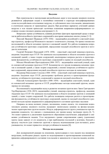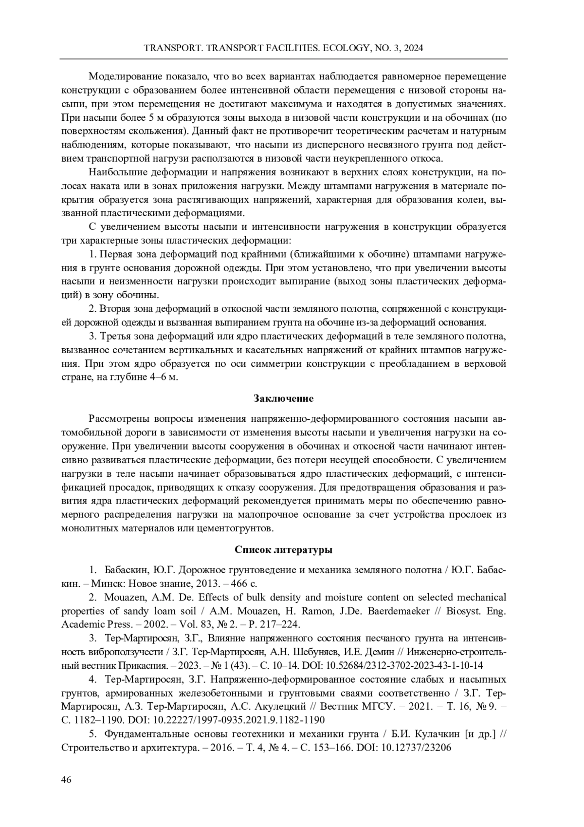 При строительстве и эксплуатации автомобильных дорог в теле насыпи земляного полотна развиваются деформации осадки и нелинейные изменения в структуре немодифицированных слоев под воздействием естественных нагрузок, от собственного веса тела насыпи, динамических и статических нагрузок от транспортных средств. При различных вариантах сочетаний данных нагрузок в теле насыпи происходят хаотичные изменения напряженно-деформированного состояния и водно-теплового режима конструкции