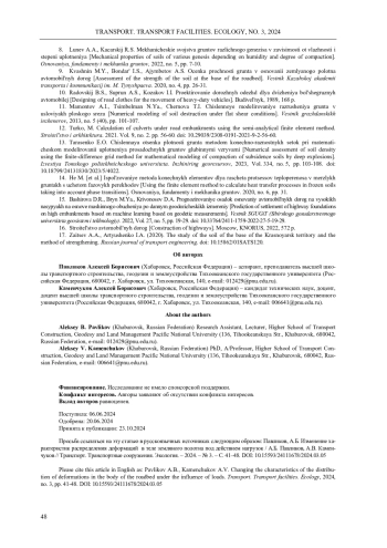 17. 	Зайцев, А.А. Исследование грунтов основания Красноярского края и способ их усиления / А.А. Зайцев, И.А. Артюшенко // Транспортные сооружения. - 2020. - № 1.  DOI: 10.15862/01SATS120  EDN: CNEWED