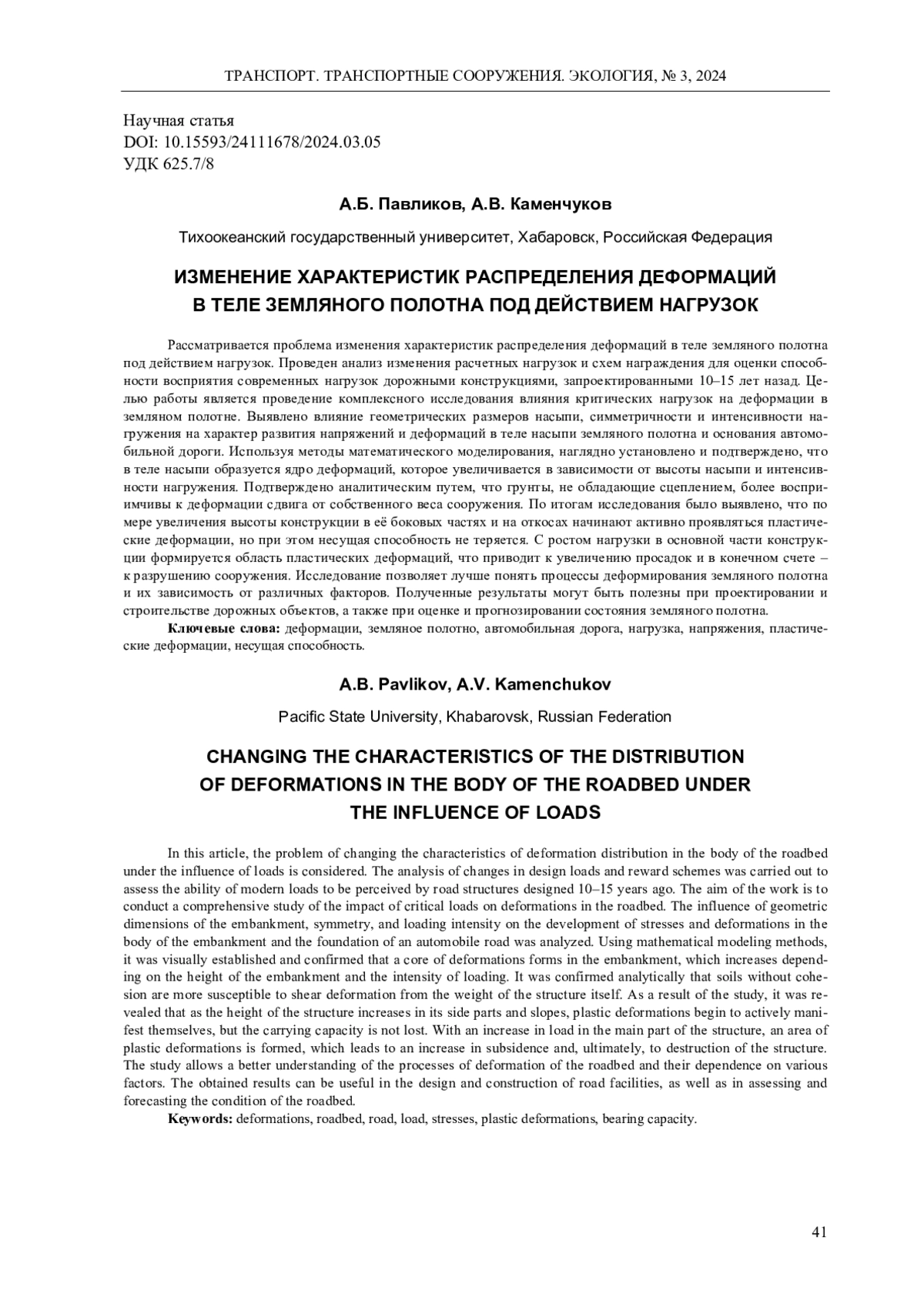 Рассматривается проблема изменения характеристик распределения деформаций в теле земляного полотна под действием нагрузок. Проведен анализ изменения расчетных нагрузок и схем награждения для оценки способности восприятия современных нагрузок дорожными конструкциями, запроектированными 10-15 лет назад. Целью работы является проведение комплексного исследования влияния критических нагрузок на деформации в земляном полотне. Выявлено влияние геометрических размеров насыпи, симметричности и интенсивности нагружения на характер развития напряжений и деформаций в теле насыпи земляного полотна и основания автомобильной дороги. Используя методы математического моделирования, наглядно установлено и подтверждено, что в теле насыпи образуется ядро деформаций, которое увеличивается в зависимости от высоты насыпи и интенсивности нагружения. Подтверждено аналитическим путем, что грунты, не обладающие сцеплением, более восприимчивы к деформации сдвига от собственного веса сооружения. По итогам исследования было выявлено, что по мере увеличения высоты конструкции в её боковых частях и на откосах начинают активно проявляться пластические деформации, но при этом несущая способность не теряется. С ростом нагрузки в основной части конструкции формируется область пластических деформаций, что приводит к увеличению просадок и в конечном счете - к разрушению сооружения. Исследование позволяет лучше понять процессы деформирования земляного полотна и их зависимость от различных факторов. Полученные результаты могут быть полезны при проектировании и строительстве дорожных объектов, а также при оценке и прогнозировании состояния земляного полотна.