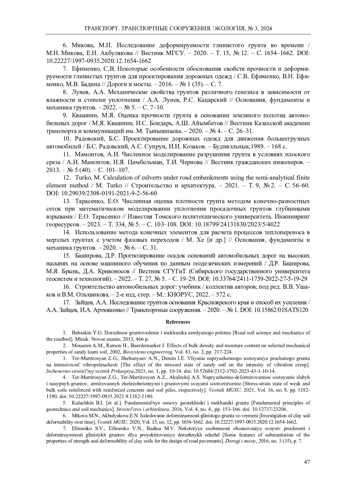 12. 	Turko, M. Calculation of culverts under road embankments using the semi-analytical finite element method / M. Turko // Строительство и архитектура. - 2021. - Т. 9, № 2. - С. 56-60.  DOI: 10.29039/2308-0191-2021-9-2-56-60  EDN: EYGFDO
