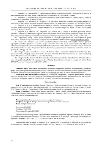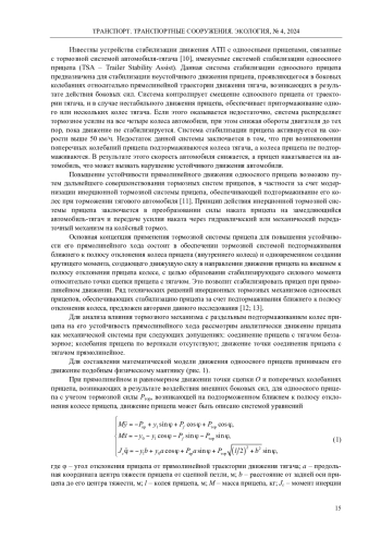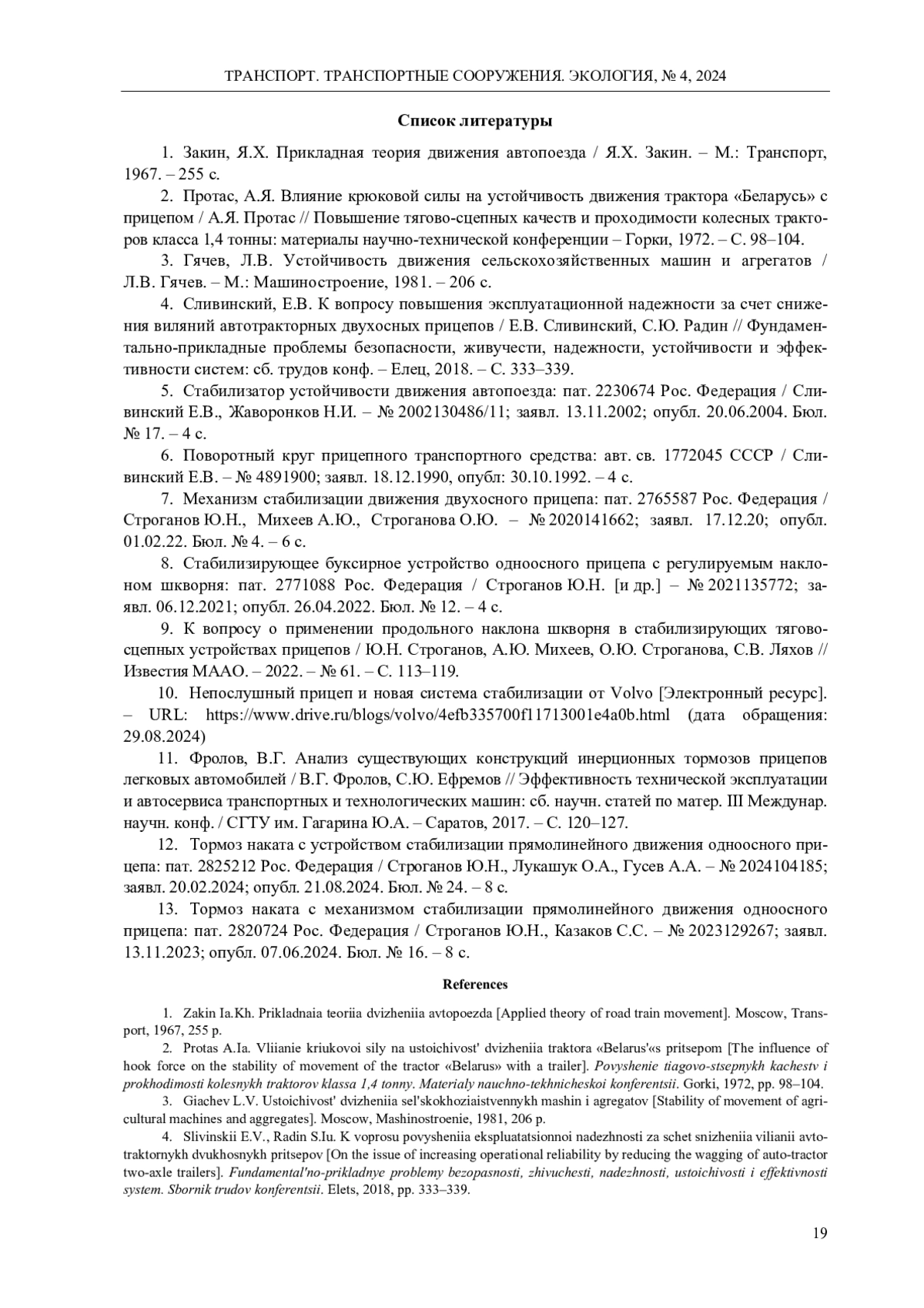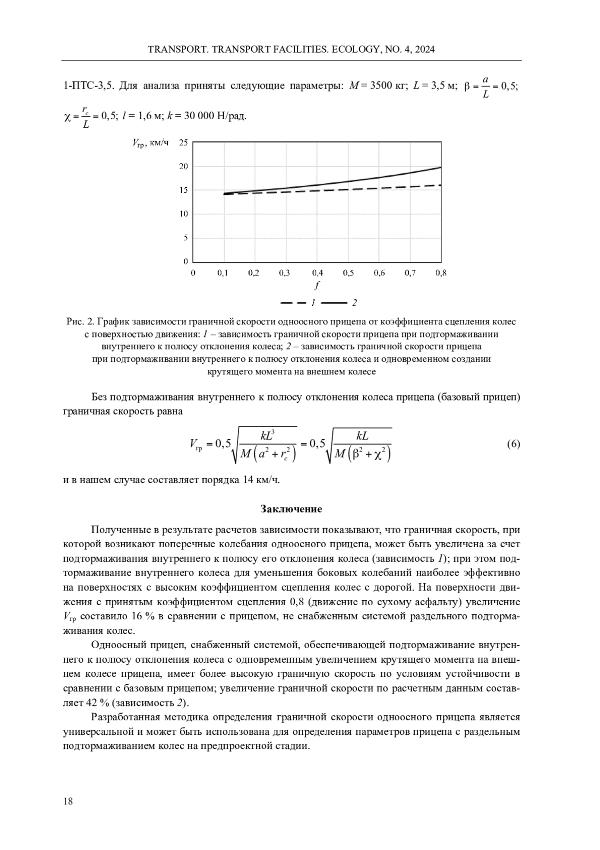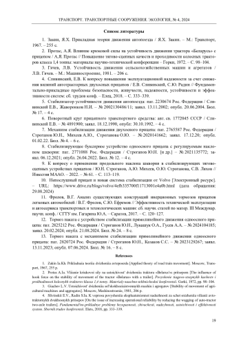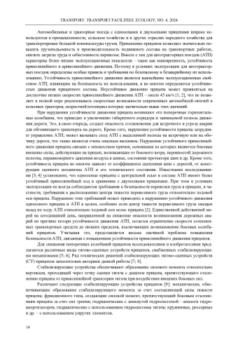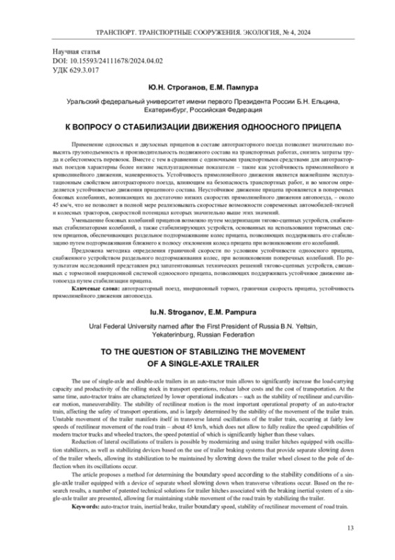Применение одноосных и двухосных прицепов в составе автотракторного поезда позволяет значительно повысить грузоподъемность и производительность подвижного состава на транспортных работах, снизить затраты труда и себестоимость перевозок. Вместе с тем в сравнении с одиночными транспортными средствами для автотракторных поездов характерны более низкие эксплуатационные показатели - такие как устойчивость прямолинейного и криволинейного движения, маневренность. Устойчивость прямолинейного движения является важнейшим эксплуатационным свойством автотракторного поезда, влияющим на безопасность транспортных работ, и во многом определяется устойчивостью движения прицепного состава. Неустойчивое движение прицепа проявляется в поперечных боковых колебаниях, возникающих на достаточно низких скоростях прямолинейного движения автопоезда, - около 45 км/ч, что не позволяет в полной мере реализовывать скоростные возможности современных автомобилей-тягачей и колесных тракторов, скоростной потенциал которых значительно выше этих значений. Уменьшение боковых колебаний прицепов возможно путем модернизации тягово-сцепных устройств, снабженных стабилизаторами колебаний, а также стабилизирующих устройств, основанных на использовании тормозных систем прицепов, обеспечивающих раздельное подтормаживание колес прицепа, позволяющих поддерживать его стабилизацию путем подтормаживания ближнего к полюсу отклонения колеса прицепа при возникновении его колебаний. Предложена методика определения граничной скорости по условиям устойчивости одноосного прицепа, снабженного устройством раздельного подтормаживания колес, при возникновении поперечных колебаний. По результатам исследований представлен ряд запатентованных технических решений тягово-сцепных устройств, связанных с тормозной инерционной системой одноосного прицепа, позволяющих поддерживать устойчивое движение автопоезда путем стабилизации прицепа.