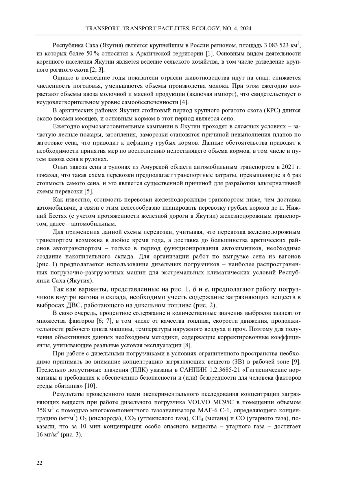 Рассматривается вопрос эксплуатации дизельных погрузчиков при выгрузке грубых кормов в процессе завоза сена в Якутию для полноценного кормообеспечения крупного скота. Своевременное и качественное кормообеспечение является актуальной проблемой для аграрного сектора республики. Периодически республика сталкивается с неуправляемыми природными факторами, влекущими за собой невыполнение планов кормозаготовительных кампаний и необходимость завоза сена из других регионов страны. В то же время территориальная неравномерность расселения и развития инфраструктуры транспорта, а также региональные особенности климата накладывают определенные ограничения в части выбора технических средств для производственных нужд. Авторами предложена схема доставки кормов, предполагающая создание накопительного склада и применение погрузчиков, работающих на дизельном топливе. При работе с дизельными погрузчиками в условиях ограниченного пространства необходимо принимать во внимание концентрацию загрязняющих веществ, в связи с чем авторами проведено экспериментальное исследование концентрации загрязняющих веществ при работе дизельного погрузчика VOLVO MC95C в помещении объемом 358 м3 с помощью многокомпонентного газоанализатора МАГ-6 С-1, определяющего концентрацию (мг/м3) O2 (кислорода), CO2 (углекислого газа), CH4 (метана) и CO (угарного газа). Исследования показали, что за 10 мин концентрация особо опасного вещества - угарного газа - достигает 16 мг/м3. Приводятся результаты исследования концентрации загрязняющих веществ в воздухе рабочей зоны погрузчика, подчеркивается опасность отработавших газов дизелей и необходимость подбора модели теоретического расчета количества сажи в отработавших газах в широком диапазоне режимов работы двигателя.