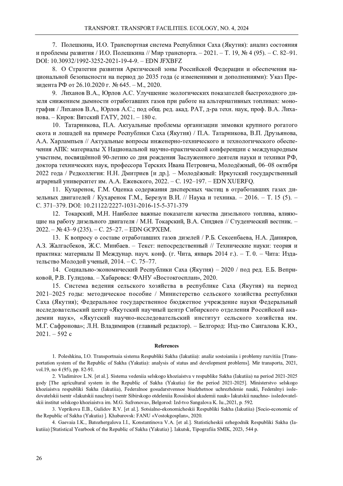 7. Полешкина, И.О. Транспортная система Республики Саха (Якутия): анализ состояния и проблемы развития / И.О. Полешкина // Мир транспорта. - 2021. - Т. 19, № 4 (95). - С. 82-91. DOI: 10.30932/1992-3252-2021-19-4-9 EDN: JFXBFZ