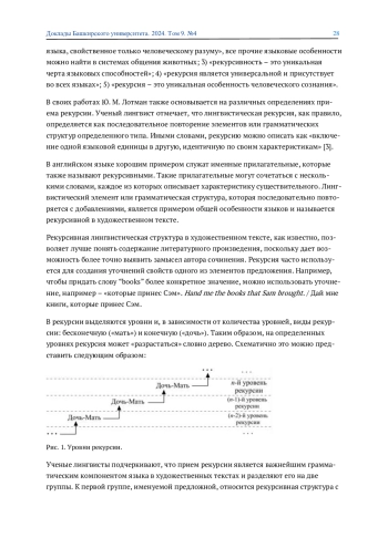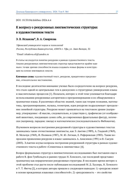 В последние десятилетия внимание ученых было сосредоточено на вопросе рекурсии, что стало одной из центральных тем в дискуссиях о структурных универсалиях языка и мыслительных процессов [1]. Полагаем, интерес к этой теме усиливается благодаря использованию рекурсивных алгоритмов в программировании и их обнаружению в грамматике языка.