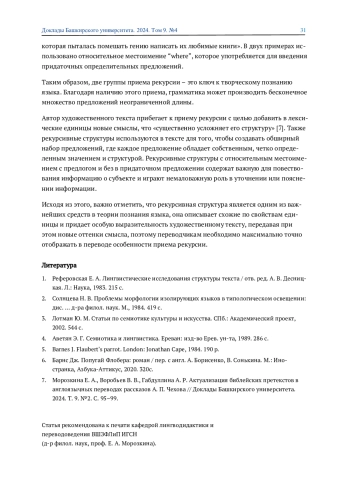 7. 	Морозкина Е. А., Воробьев В. В., Габдуллина А. Р. Актуализация библейских претекстов в англоязычных переводах рассказов А. П. Чехова // Доклады Башкирского университета. 2024. Т. 9. №2. С. 95-99. EDN: LSOSXH