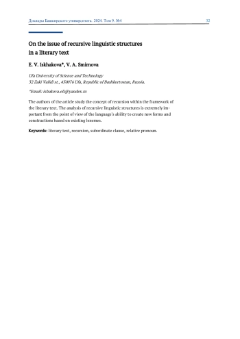 В статье исследуется понятие рекурсии в рамках художественного текста. Анализ рекурсивных лингвистических структур представляется крайне важным с точки зрения способности языка создавать новые формы и конструкции на основе имеющихся лексем.