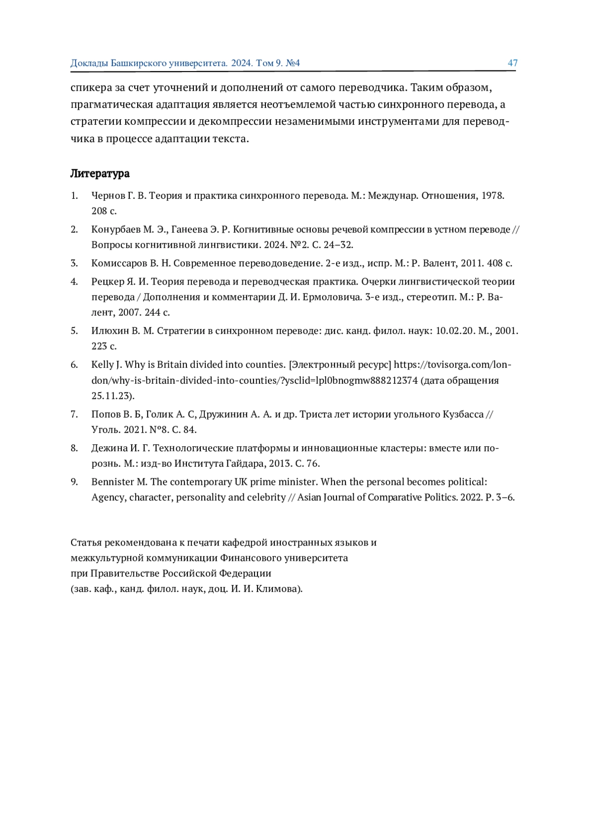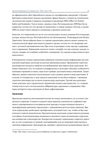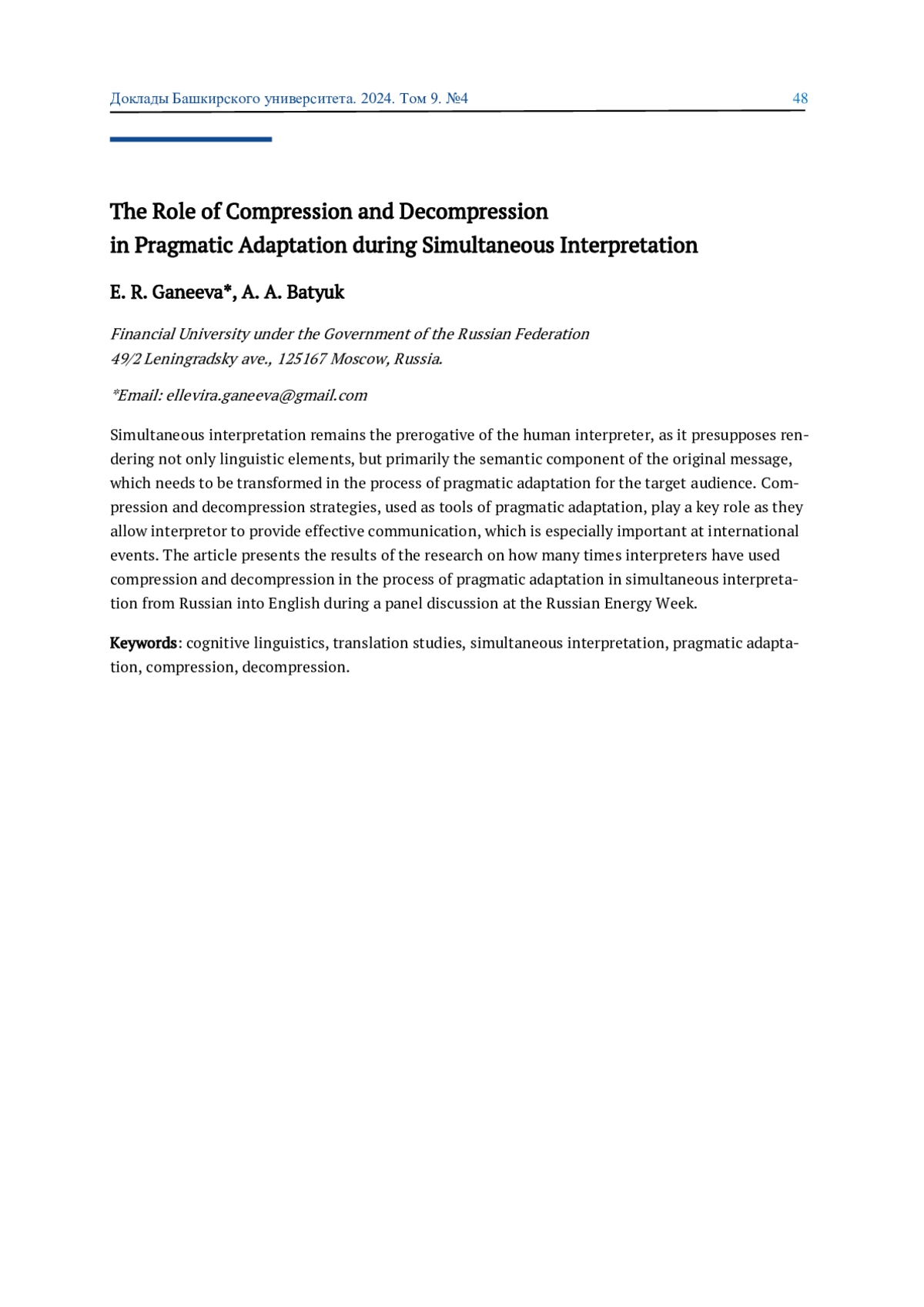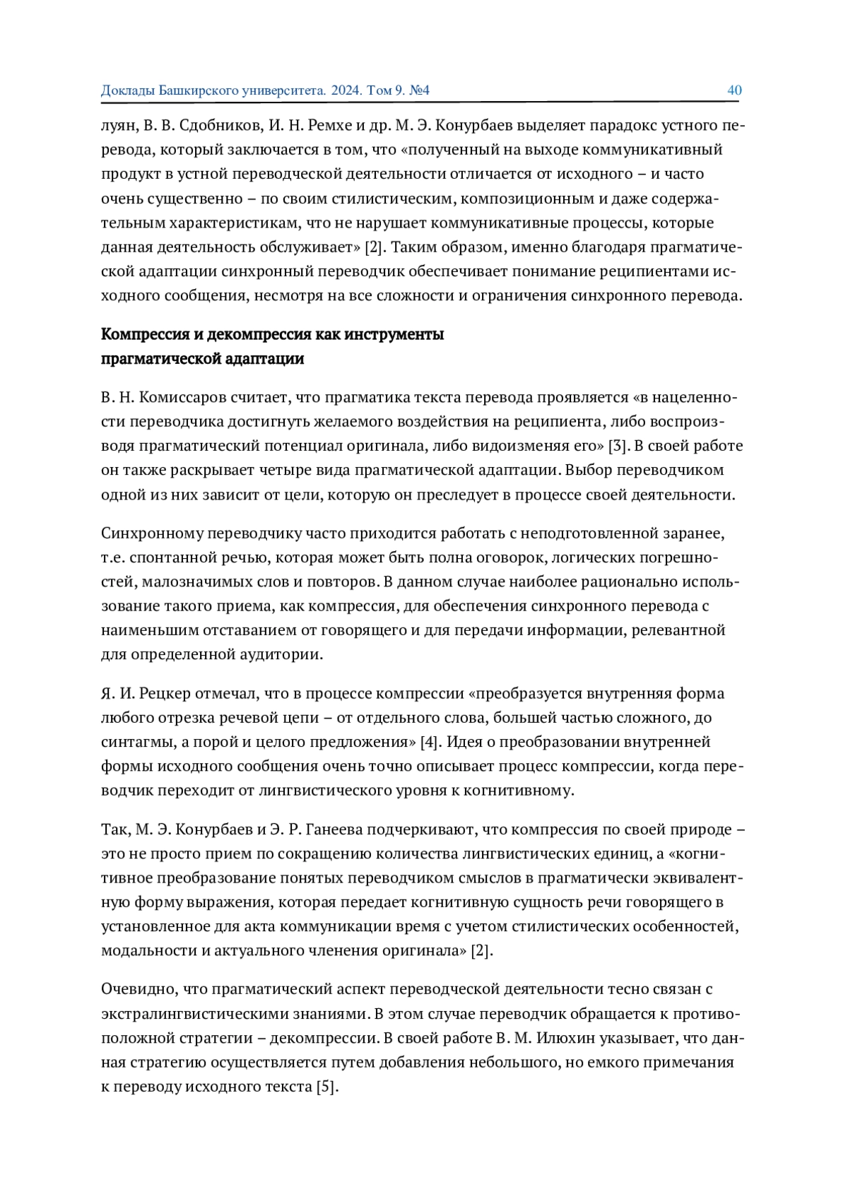 2. 	Конурбаев М. Э., Ганеева Э. Р. Когнитивные основы речевой компрессии в устном переводе // Вопросы когнитивной лингвистики. 2024. №2. С. 24-32. EDN: RZOWZR