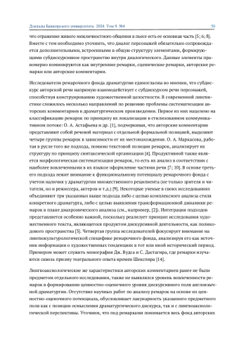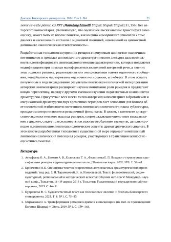 1. Астафьева О. А., Блохин А. В., Колоскова Т. А., Филиппова Е. П. Локально-структурная классификация ремарок в драматургическом тексте // Казанская наука. 2020. №9. С. 39-41. EDN: UCXVMV