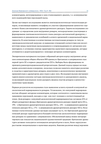 В статье приведены результаты системного анализа ремарочного фонда англоязычной драматургии XX и XXI вв. с позиций дискурсивно-аксиологического подхода. Представлена и проиллюстрирована шестикомпонентная лингвоаксиологическая типология ремарок, формирующих особый субдискурс внутри стилизованного диалога. Доказано, что комментарии драматурга, сопровождающие оценочные реплики персонажей, конкретизируют комплексные ценностно-оценочные смыслы и участвуют в конструировании лингвоаксиологического уровня коммуникативной ситуации.