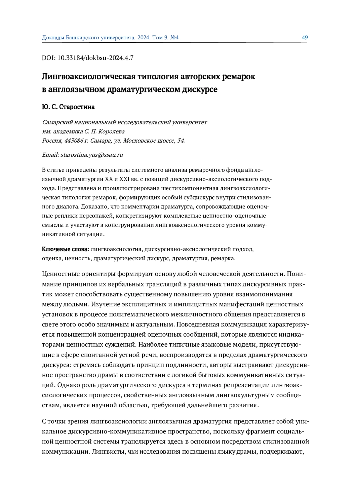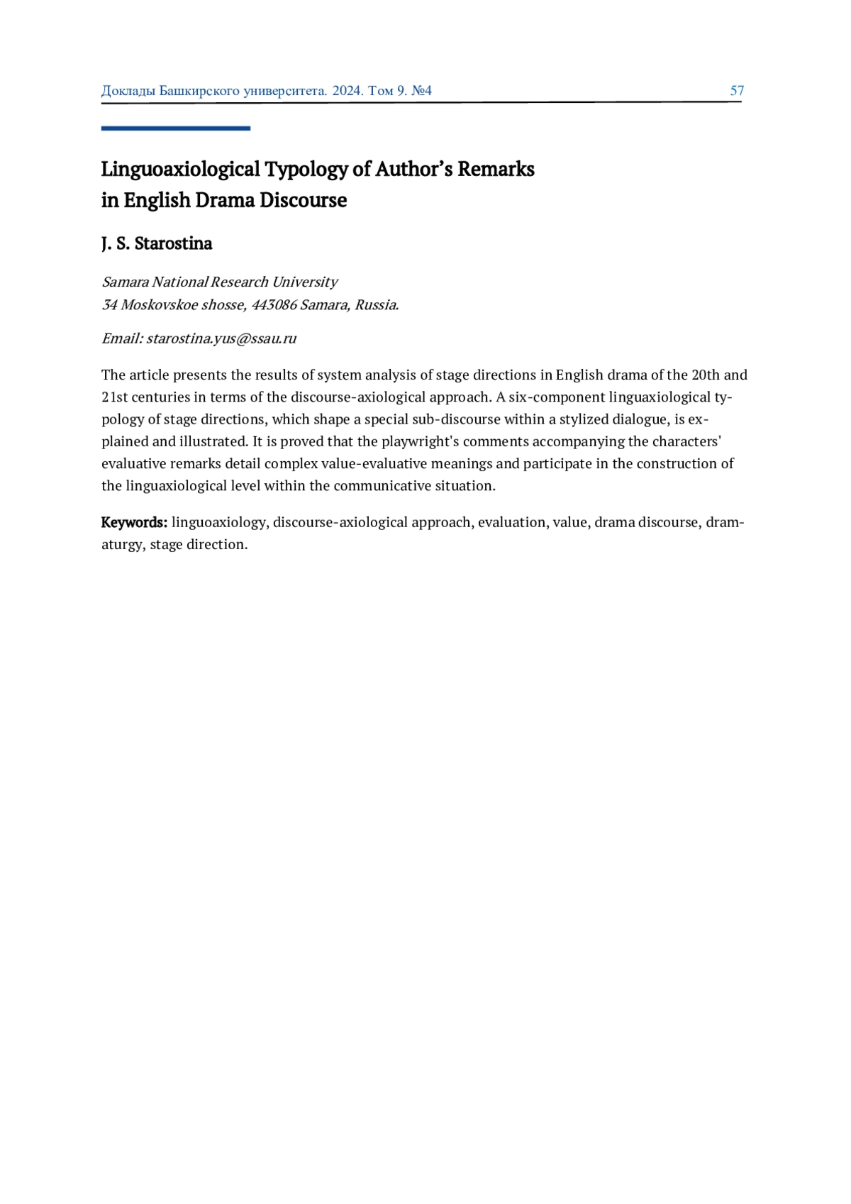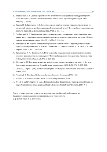 7. Стефанович М. В. Особенности иннективных ремарок, выраженных качественными наречиями на -ly с эмотивно-оценочным компонентом, в драматургическом дискурсе // Когнитивные исследования языка. 2024. №1-2(57). С. 223-226. EDN: NBXUDH