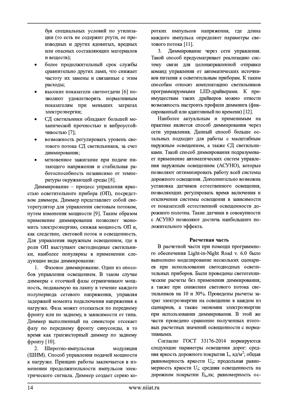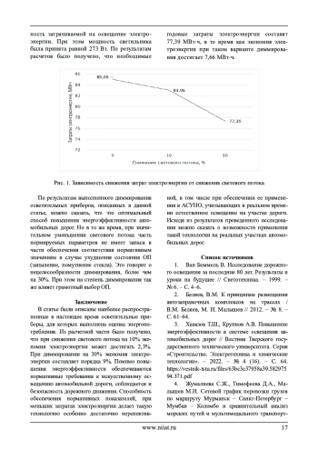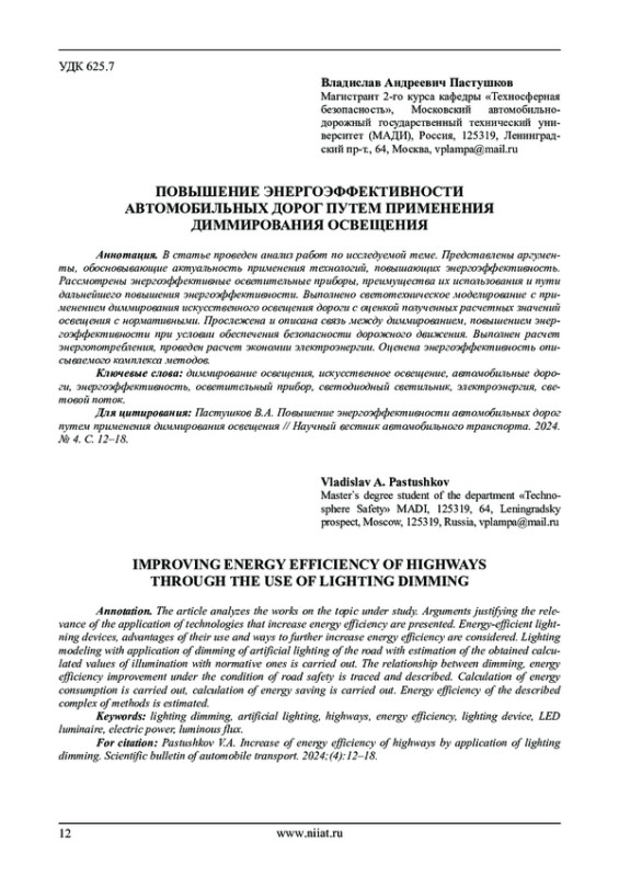 В статье проведен анализ работ по исследуемой теме. Представлены аргументы, обосновывающие актуальность применения технологий, повышающих энергоэффективность. Рассмотрены энергоэффективные осветительные приборы, преимущества их использования и пути дальнейшего повышения энергоэффективности. Выполнено светотехническое моделирование с применением диммирования искусственного освещения дороги с оценкой полученных расчетных значений освещения с нормативными. Прослежена и описана связь между диммированием, повышением энергоэффективности при условии обеспечения безопасности дорожного движения. Выполнен расчет энергопотребления, проведен расчет экономии электроэнергии. Оценена энергоэффективность описываемого комплекса методов.