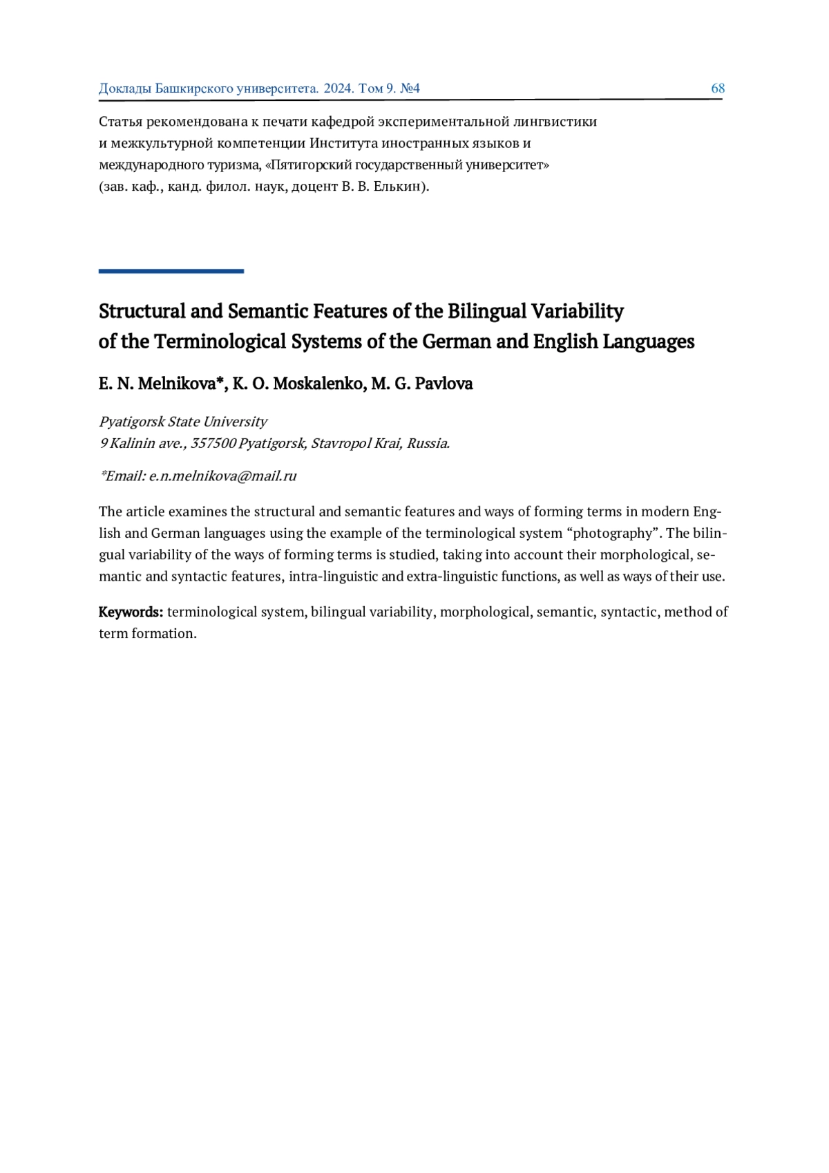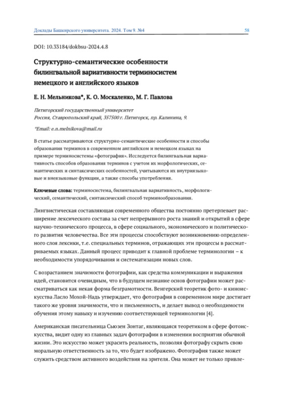 В статье рассматриваются структурно-семантические особенности и способы образования терминов в современном английском и немецком языках на примере терминосистемы «фотография». Исследуется билингвальная вариативность способов образования терминов с учетом их морфологических, семантических и синтаксических особенностей, учитываются их внутриязыковые и внеязыковые функции, а также способы употребления.