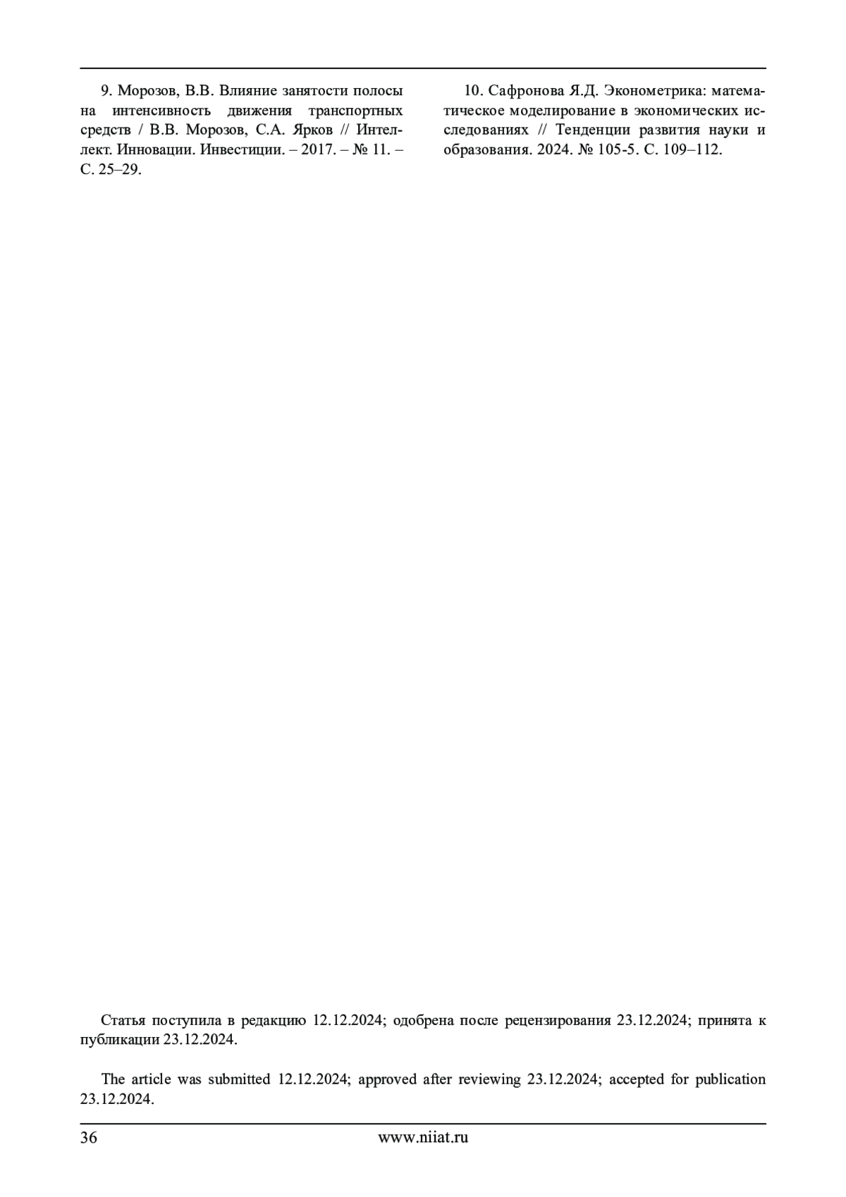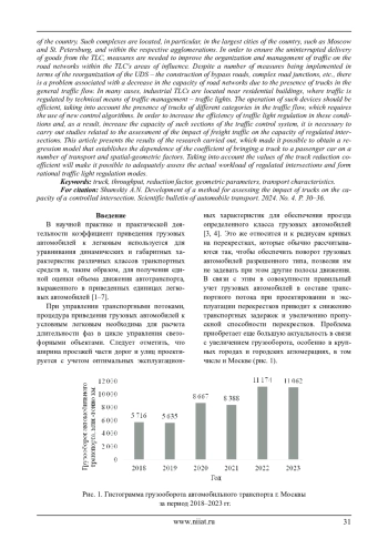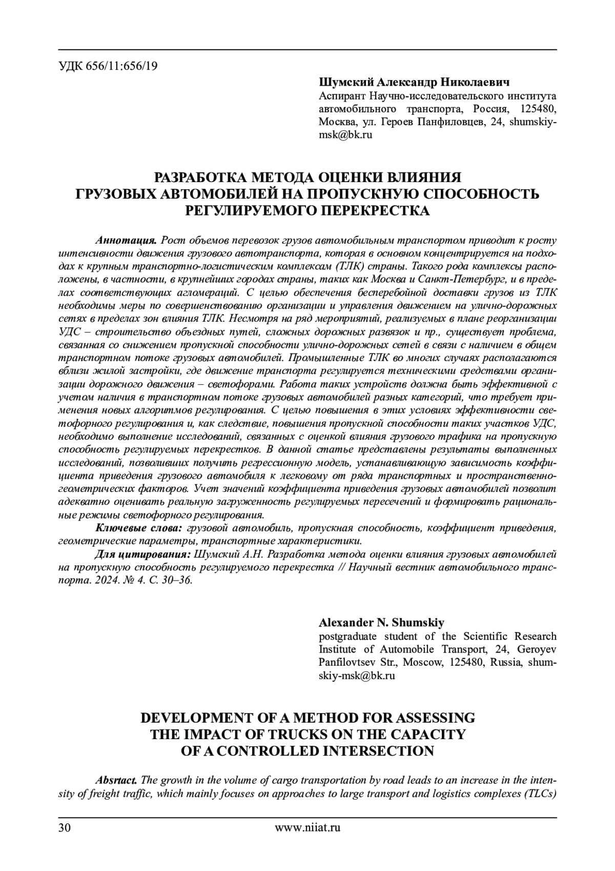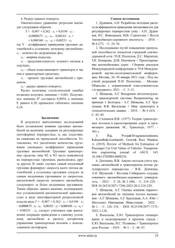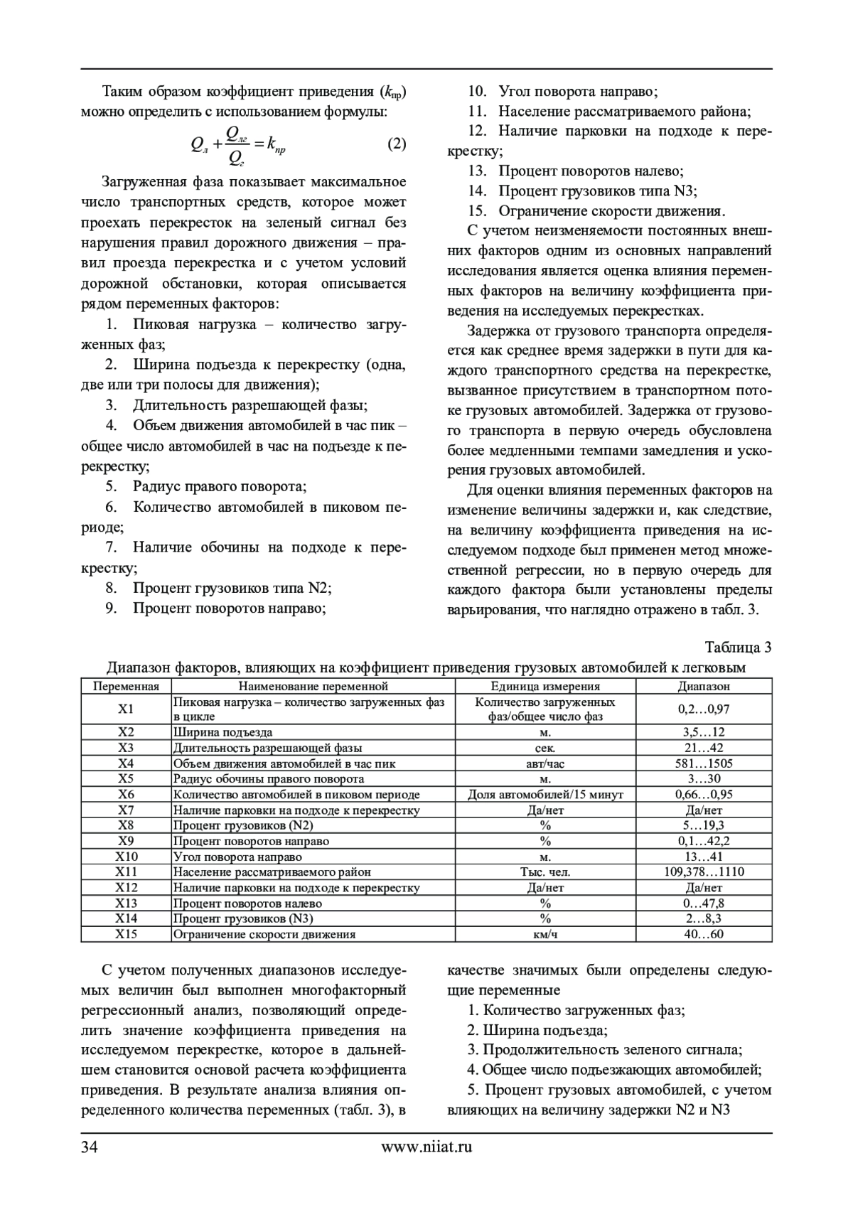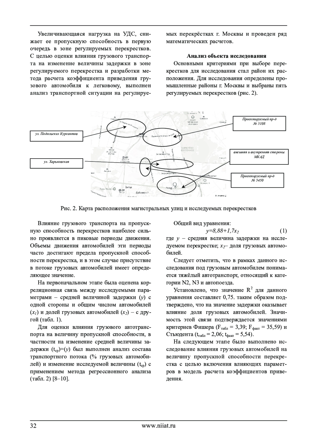 Рост объемов перевозок грузов автомобильным транспортом приводит к росту интенсивности движения грузового автотранспорта, которая в основном концентрируется на подходах к крупным транспортно-логистическим комплексам (ТЛК) страны. Такого рода комплексы расположены, в частности, в крупнейших городах страны, таких как Москва и Санкт-Петербург, и в пределах соответствующих агломераций. С целью обеспечения бесперебойной доставки грузов из ТЛК необходимы меры по совершенствованию организации и управления движением на улично-дорожных сетях в пределах зон влияния ТЛК. Несмотря на ряд мероприятий, реализуемых в плане реорганизации УДС – строительство объездных путей, сложных дорожных развязок и пр., существует проблема, связанная со снижением пропускной способности улично-дорожных сетей в связи с наличием в общем транспортном потоке грузовых автомобилей. Промышленные ТЛК во многих случаях располагаются вблизи жилой застройки, где движение транспорта регулируется техническими средствами организации дорожного движения – светофорами. Работа таких устройств должна быть эффективной с учетом наличия в транспортном потоке грузовых автомобилей разных категорий, что требует применения новых алгоритмов регулирования. С целью повышения в этих условиях эффективности светофорного регулирования и, как следствие, повышения пропускной способности таких участков УДС, необходимо выполнение исследований, связанных с оценкой влияния грузового трафика на пропускную способность регулируемых перекрестков. В данной статье представлены результаты выполненных исследований, позволивших получить регрессионную модель, устанавливающую зависимость коэффициента приведения грузового автомобиля к легковому от ряда транспортных и пространственногеометрических факторов. Учет значений коэффициента приведения грузовых автомобилей позволит адекватно оценивать реальную загруженность регулируемых пересечений и формировать рациональные режимы светофорного регулирования.