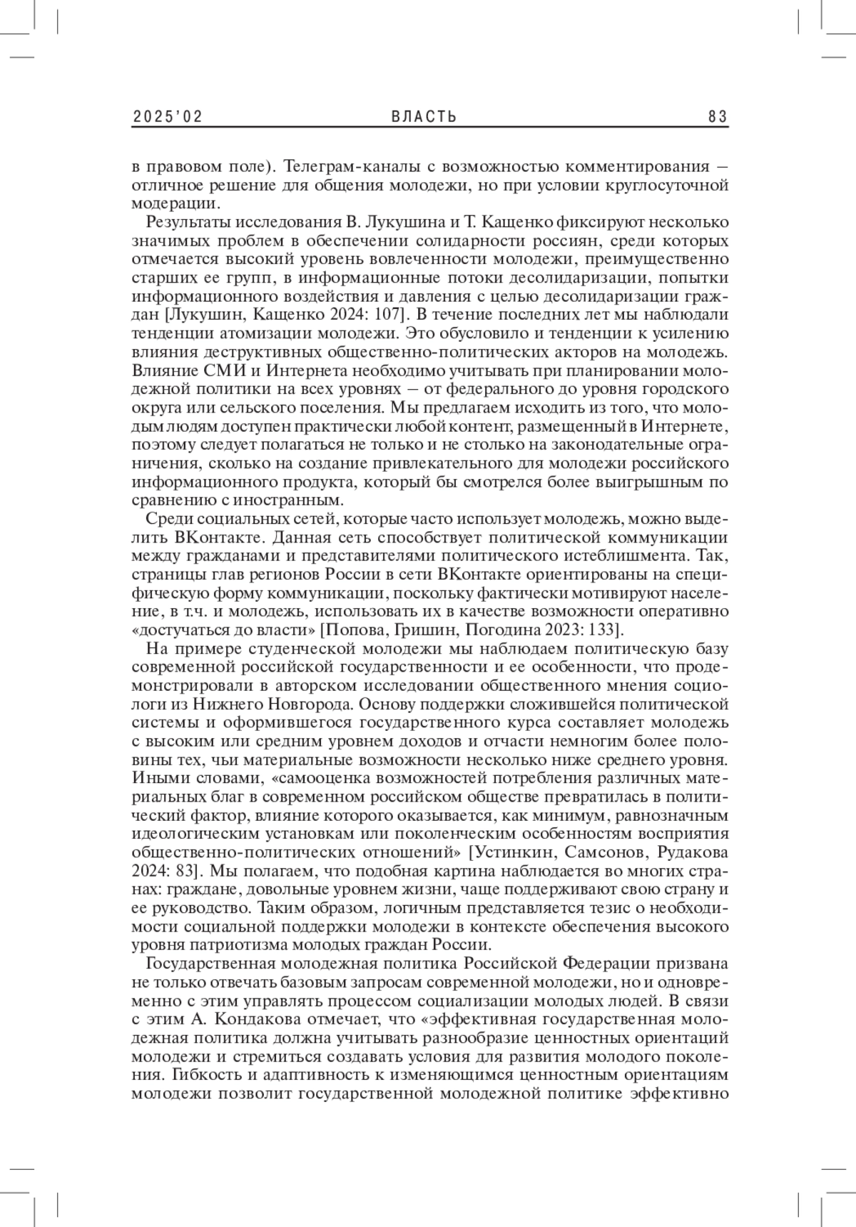 5. Лукушин В.А., Кащенко Т.Л. 2024. Характеристика масштаба и направленности (де)солидаризации современного российского общества. - Власть. Т. 32. № 5. С. 102-108. EDN: GBKQBT
