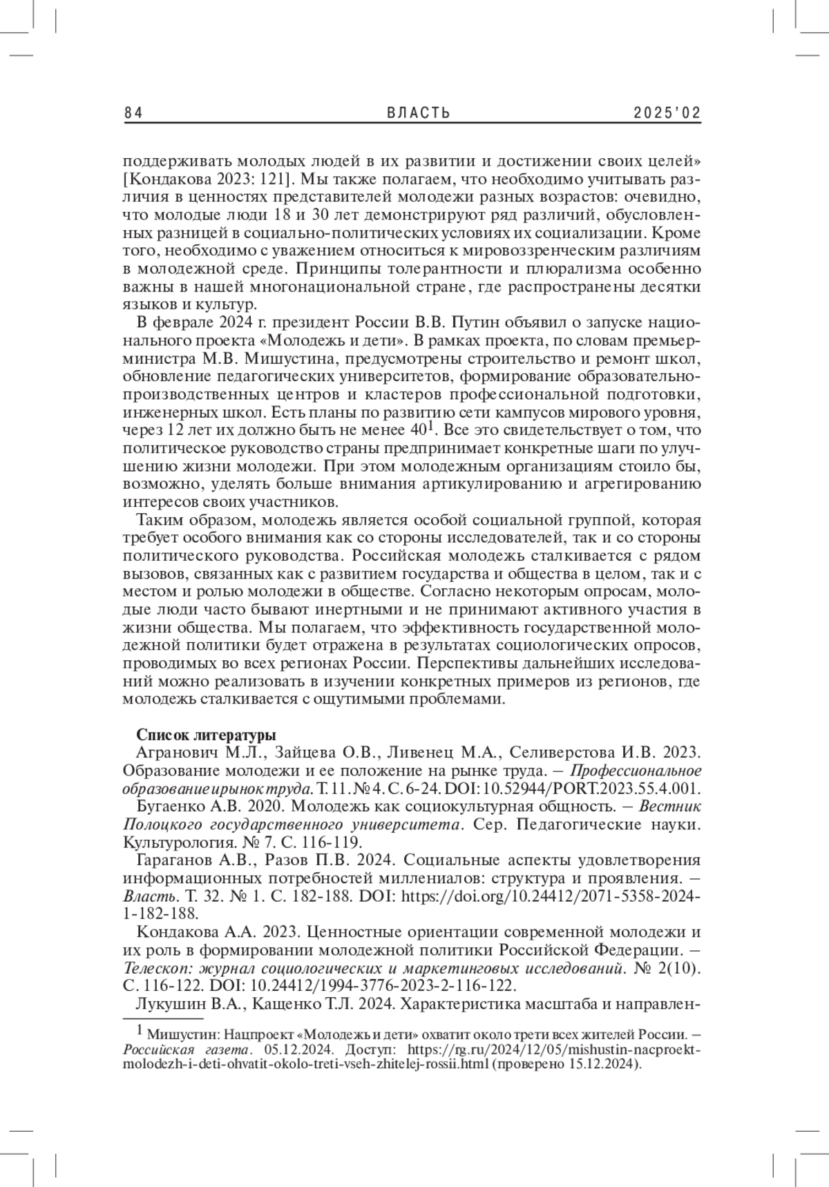 4. Кондакова А.А. 2023. Ценностные ориентации современной молодежи и их роль в формировании молодежной политики Российской Федерации. - Телескоп: журнал социологических и маркетинговых исследований. № 2(10). С. 116-122. DOI: 10.24412/1994-3776-2023-2-116-122
