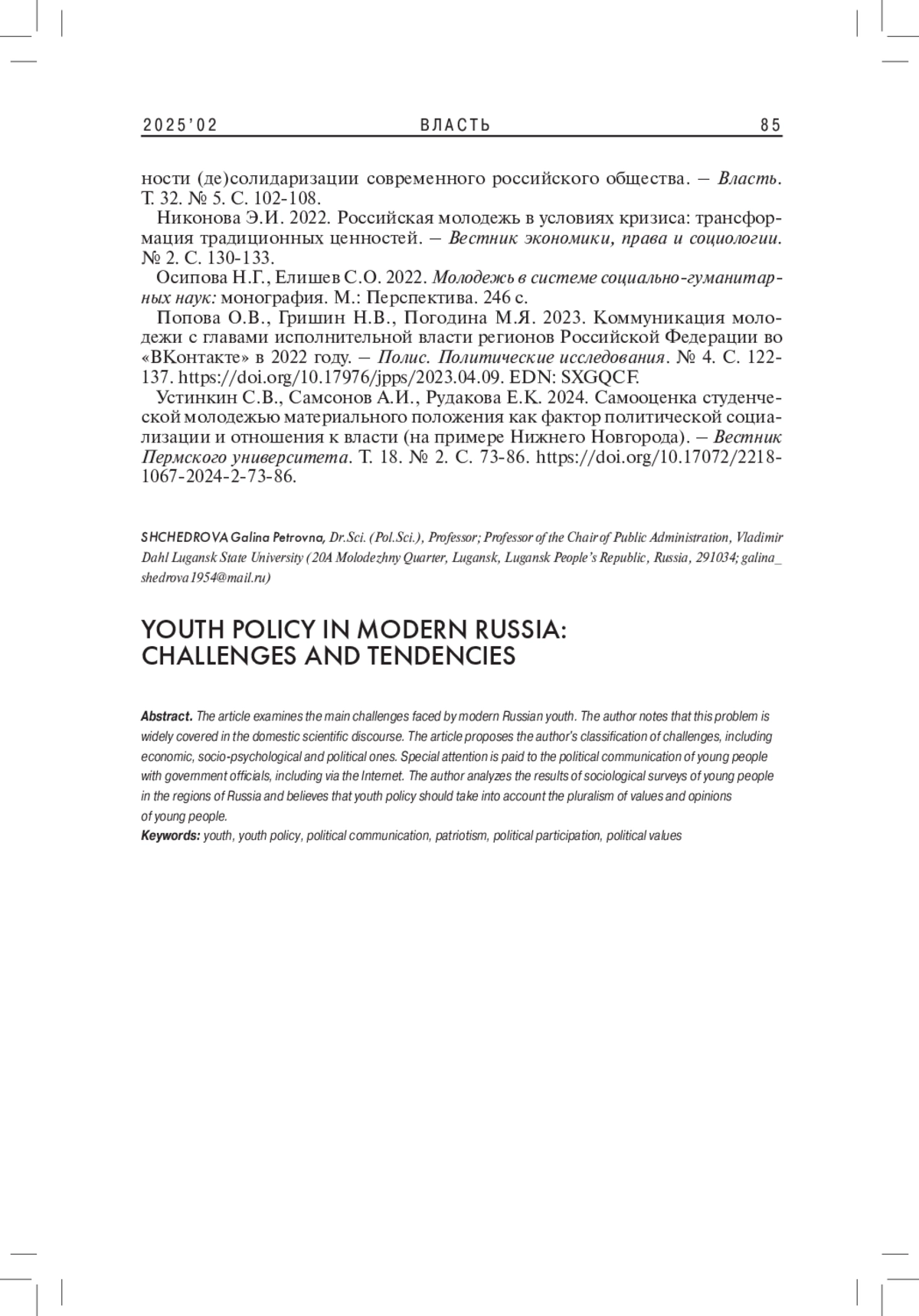 6. Никонова Э.И. 2022. Российская молодежь в условиях кризиса: трансформация традиционных ценностей. - Вестник экономики, права и социологии. № 2. С. 130-133. EDN: JIUIPF