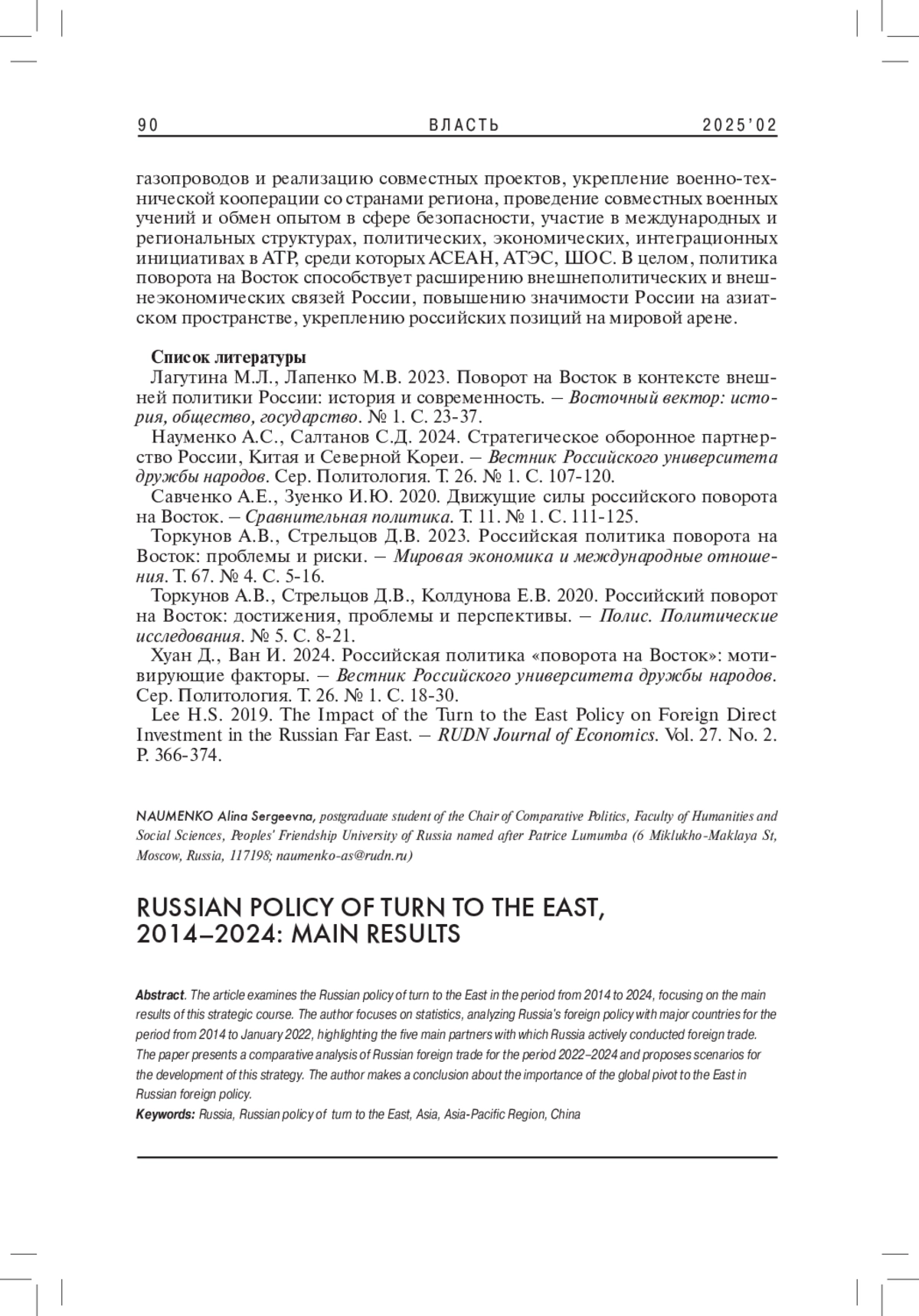 1. Лагутина М.Л., Лапенко М.В. 2023. Поворот на Восток в контексте внешней политики России: история и современность. - Восточный вектор: история, общество, государство. № 1. С. 23-37. EDN: MZSBSX