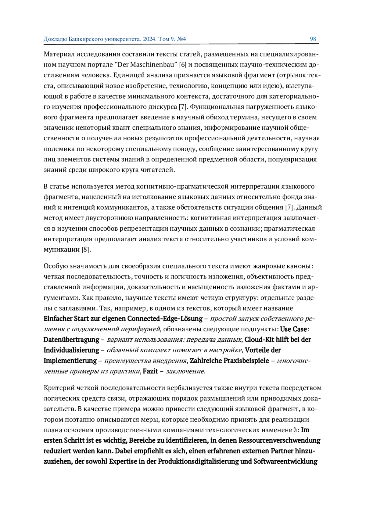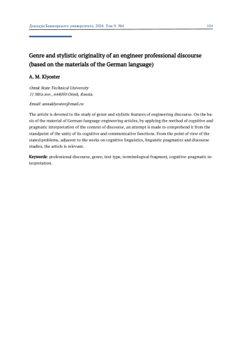 Статья посвящена изучению жанрово-стилистических особенностей инженерного дискурса. На материале немецкоязычных статей инженерной направленности посредством метода когнитивной и прагматической интерпретации содержания дискурса предпринимается попытка его осмысления с позиций единства его когнитивной и коммуникативной функций. С точки зрения заявленной проблематики, примыкая к работам по когнитивной лингвистике, лингвистической прагматике и дискурсологии, статья является актуальной.
