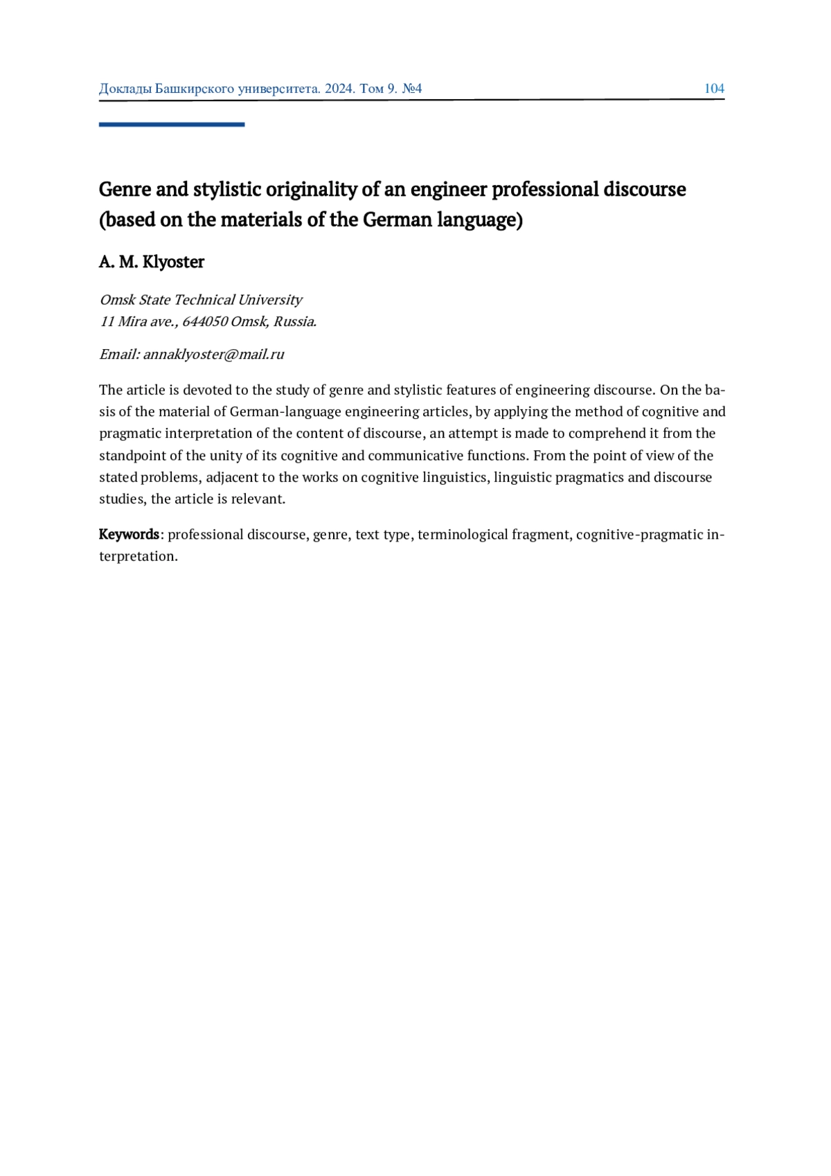7. 	Galich G. G., Klyoster A. M. Cognitive and pragmatic interpretation of terminological fragments in the professional discourse // Advances in Intelligent Systems and Computing. 2018. Т. 677. С. 242-249. EDN: XNQWMG