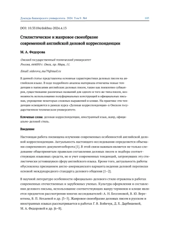 Настоящая работа посвящена изучению современных особенностей английской деловой корреспонденции. Актуальность настоящего исследования определяется объемами современного документооборота [1]. В этой связи важным является не только следование общепринятым правилам составления деловых писем и подбора соответствующих языковых средств, но и учет современных тенденций, затронувших эту стилистически устоявшуюся сферу английского языка. Кроме того, актуальность работы обусловлена признанием англо-американского варианта ведения деловой переписки основой международного стандарта делового общения [1–2].