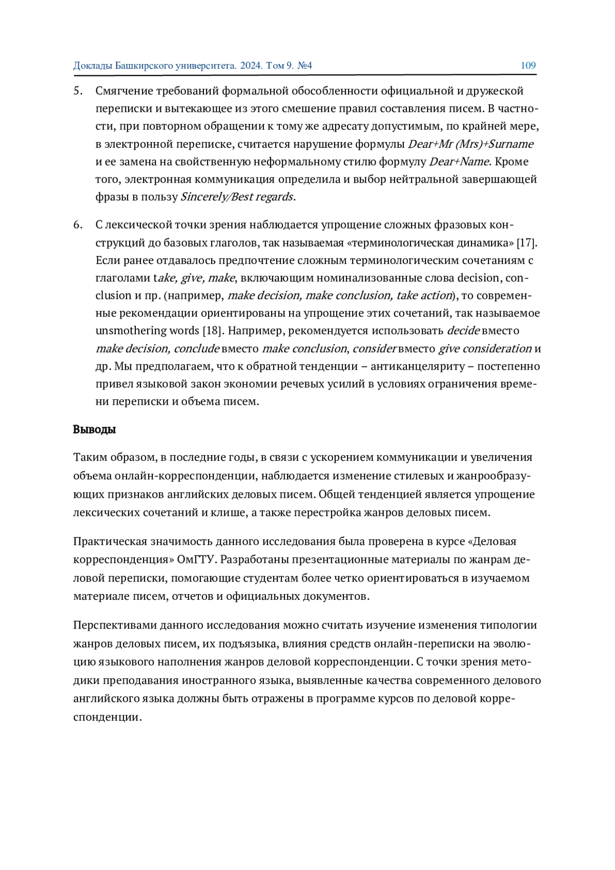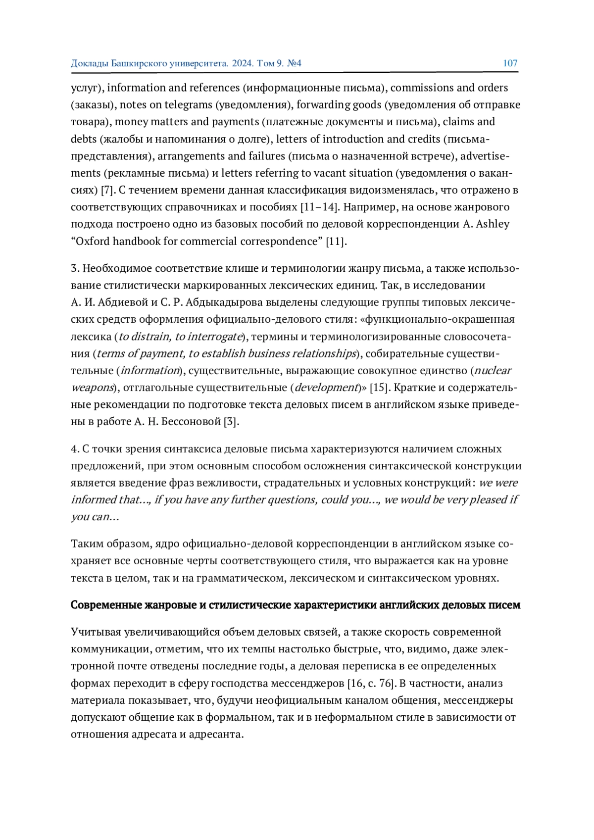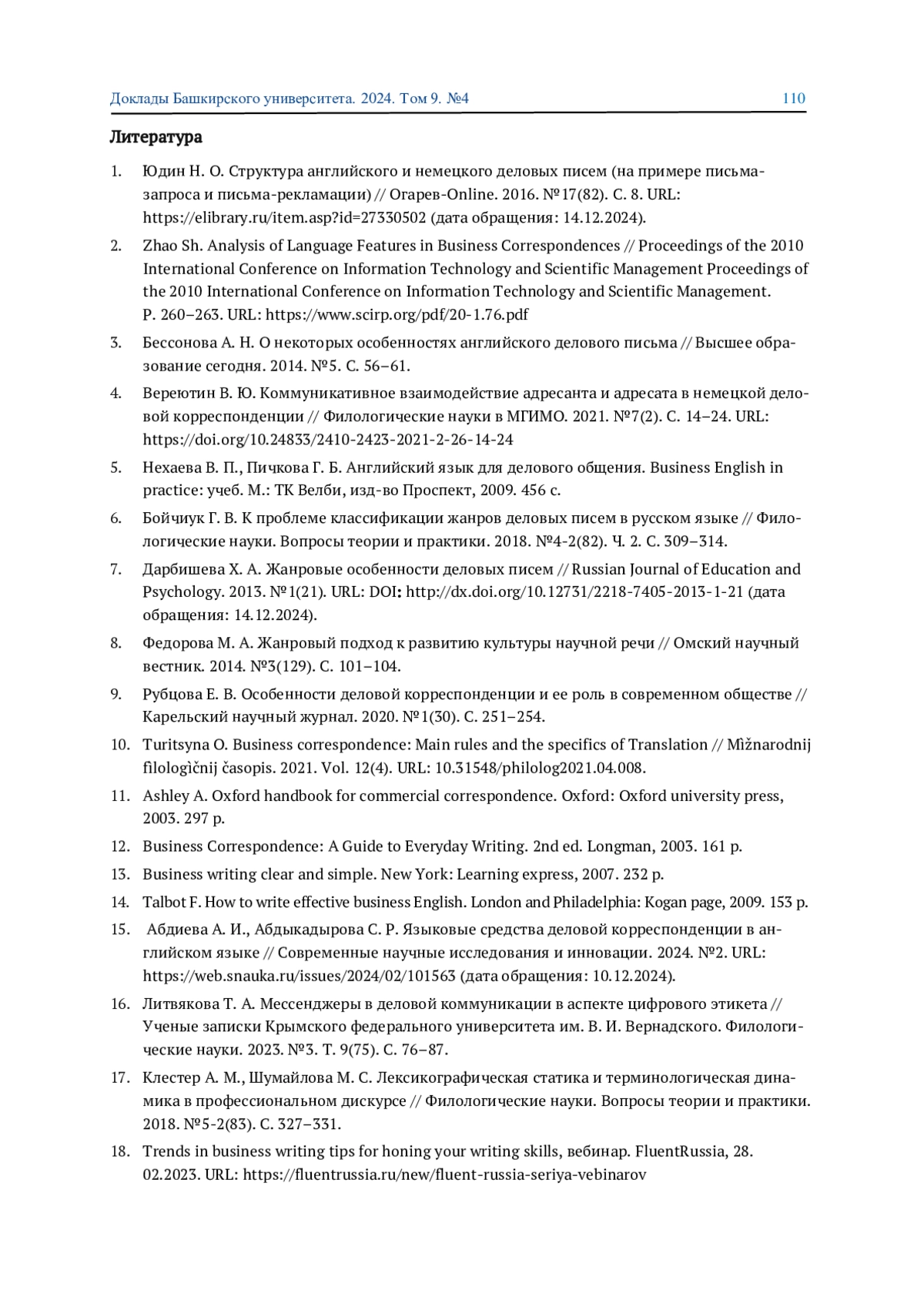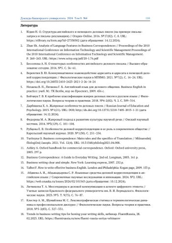 2. Zhao Sh. Analysis of Language Features in Business Correspondences // Proceedings of the 2010 International Conference on Information Technology and Scientific Management Proceedings of the 2010 International Conference on Information Technology and Scientific Management. P. 260-263. URL: https://www.scirp.org/pdf/20-1.76.pdf.