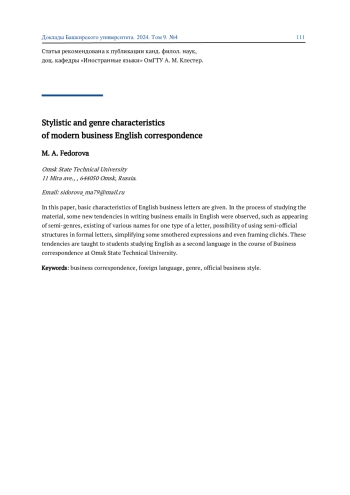 В данной статье представлены основные характеристики деловых писем на английском языке. В ходе подробного анализа материала отмечены новые тенденции в написании английских деловых писем, такие как появление субжанров, существование различных названий для одного и того же типа писем, возможность использования полуформальных конструкций в официальных письмах, упрощение некоторых сложных выражений и клише. На практике эти тенденции освещаются в рамках курса «Деловая корреспонденция» в Омском государственном техническом университете.