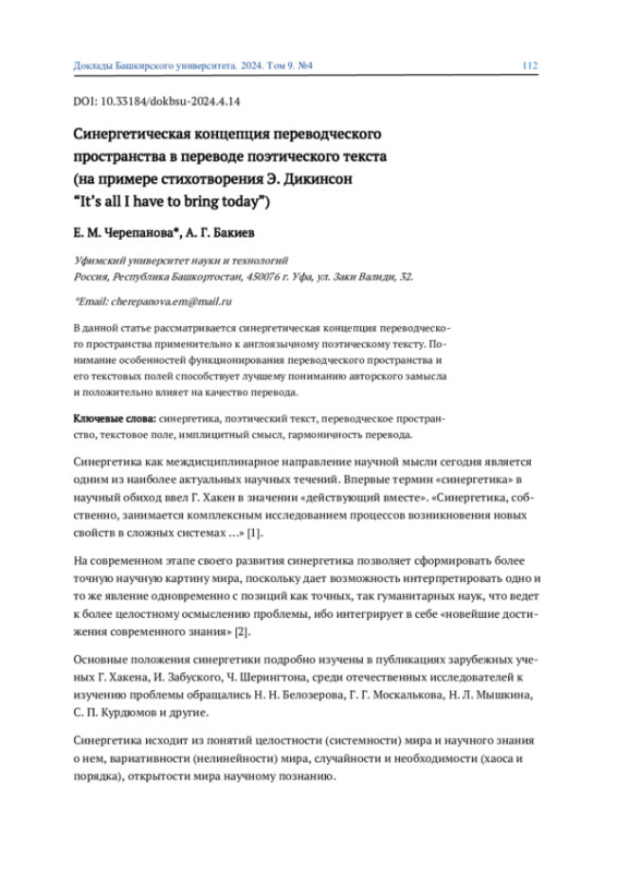 3. Кушнина Л. В. Основные принципы синергетики перевода // Вестник Удмуртского ун-та. 2011. Серия: История и филология: Вып. 4. С. 173. EDN: ONSZSB