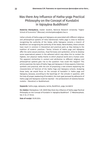 Индийские школы хатха-йоги и ваджраяны связаны с разными религиозно-философскими системами Индии (даршанами): хатха-йога – с признающей авторитет вед ведантой, ваджраяна – с непризнающим авторитет вед буддизмом. Несмотря на это, они имеют довольно много общего в их теоретической и практической составляющих, поскольку принадлежат традиции эзотерических практик (тантре). Эти школы используют одинаковые сексуальные практики, ритуальные формулы и символизм, стремятся развить в ученике сверхъестественные силы и позволить ему соприкоснуться с высшей, нефизической реальностью, благодаря которой существуют физический мир и человек. Видимые сходства в содержаниях и принадлежность различным религиозно-философским системам порождают вопрос: как такое могло произойти? В данной статье рассматриваются тексты хатха-йоги и ваджраяны в трех аспектах: историческом, символическом и практическом с целью предложить новую схему, объясняющую характеристики тантризма школ хатха-йоги и ваджраяны. При анализе текстов мы сфокусируемся на концепции кундалини в хатха-йоге и ваджраяне, потому что, согласно учениям упомянутых школ, с помощью правильного пробуждения кундалини достигается главная цель, преследуемая адептами хатха-йоги и ваджраяны – достижение мокши (Sanskr. mokṣa – освобождение) или состояния Будды.
