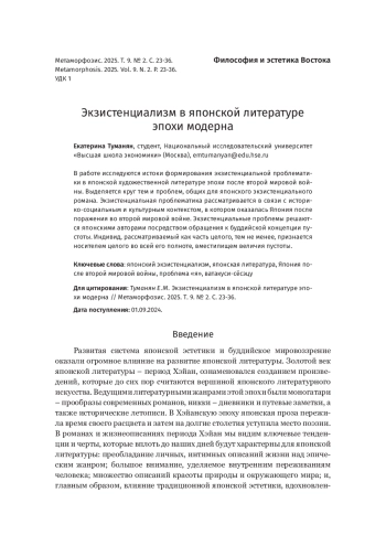 В работе исследуются истоки формирования экзистенциальной проблематики в японской художественной литературе эпохи после второй мировой войны. Выделяется круг тем и проблем, общих для японского экзистенциального романа. Экзистенциальная проблематика рассматривается в связи с историко-социальным и культурным контекстом, в котором оказалась Япония после поражения во второй мировой войне. Экзистенциальные проблемы решаются японскими авторами посредством обращения к буддийской концепции пустоты. Индивид, рассматриваемый как часть целого, тем не менее, признается носителем целого во всей его полноте, вместилищем величия пустоты.