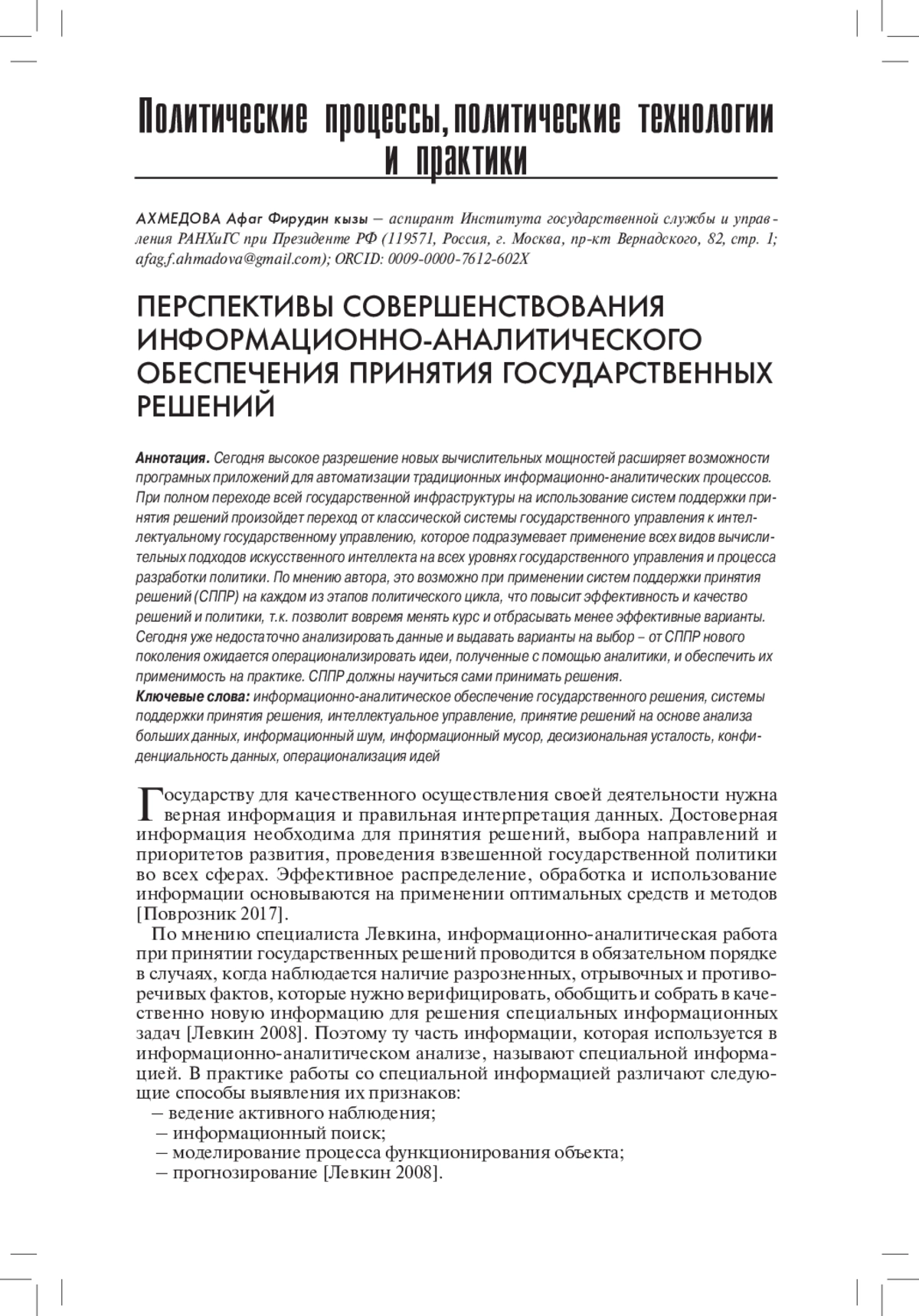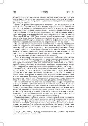 Сегодня высокое разрешение новых вычислительных мощностей расширяет возможности программных приложений для автоматизации традиционных информационно-аналитических процессов. При полном переходе всей государственной инфраструктуры на использование систем поддержки принятия решений произойдет переход от классической системы государственного управления к интеллектуальному государственному управлению, которое подразумевает применение всех видов вычислительных подходов искусственного интеллекта на всех уровнях государственного управления и процесса разработки политики. По мнению автора, это возможно при применении систем поддержки принятия решений (СППР) на каждом из этапов политического цикла, что повысит эффективность и качество решений и политики, т. к. позволит вовремя менять курс и отбрасывать менее эффективные варианты. Сегодня уже недостаточно анализировать данные и выдавать варианты на выбор - от СППР нового поколения ожидается операционализировать идеи, полученные с помощью аналитики, и обеспечить их применимость на практике. СППР должны научиться сами принимать решения.