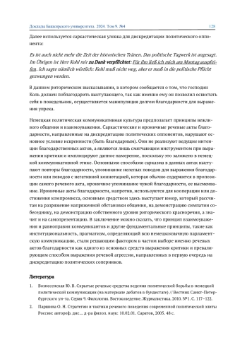 1. 	Вознесенская Ю. В. Скрытые речевые средства ведения политической борьбы в немецкой политической коммуникации (на материале дебатов в бундестаге) // Вестник Санкт-Петербургского ун-та. Серия 9. Филология. Востоковедение. Журналистика. 2010. №1. С. 117-122. EDN: MVRLSZ