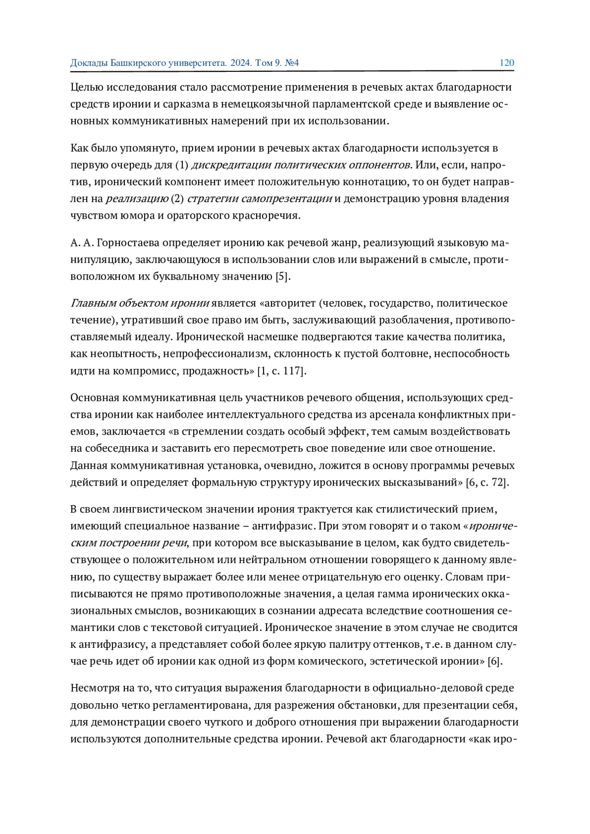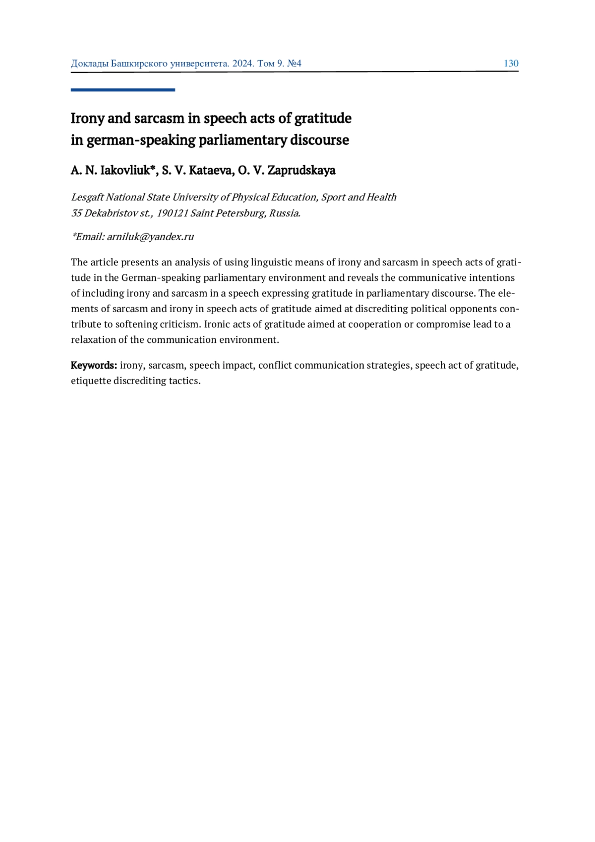 В статье представлен анализ использования языковых средств иронии и сарказма в речевых актах благодарности в немецкоязычной парламентской среде, выявлены коммуникативные интенции включения иронии и сарказма в благодарственную речь в парламентском дискурсе. Элементы сарказма и иронии в речевых актах благодарности, направленные на дискредитацию политических оппонентов, способствуют смягчению критики. Ироничные акты благодарности, направленные на кооперацию или достижение компромисса, приводят к разряжению обстановки общения.
