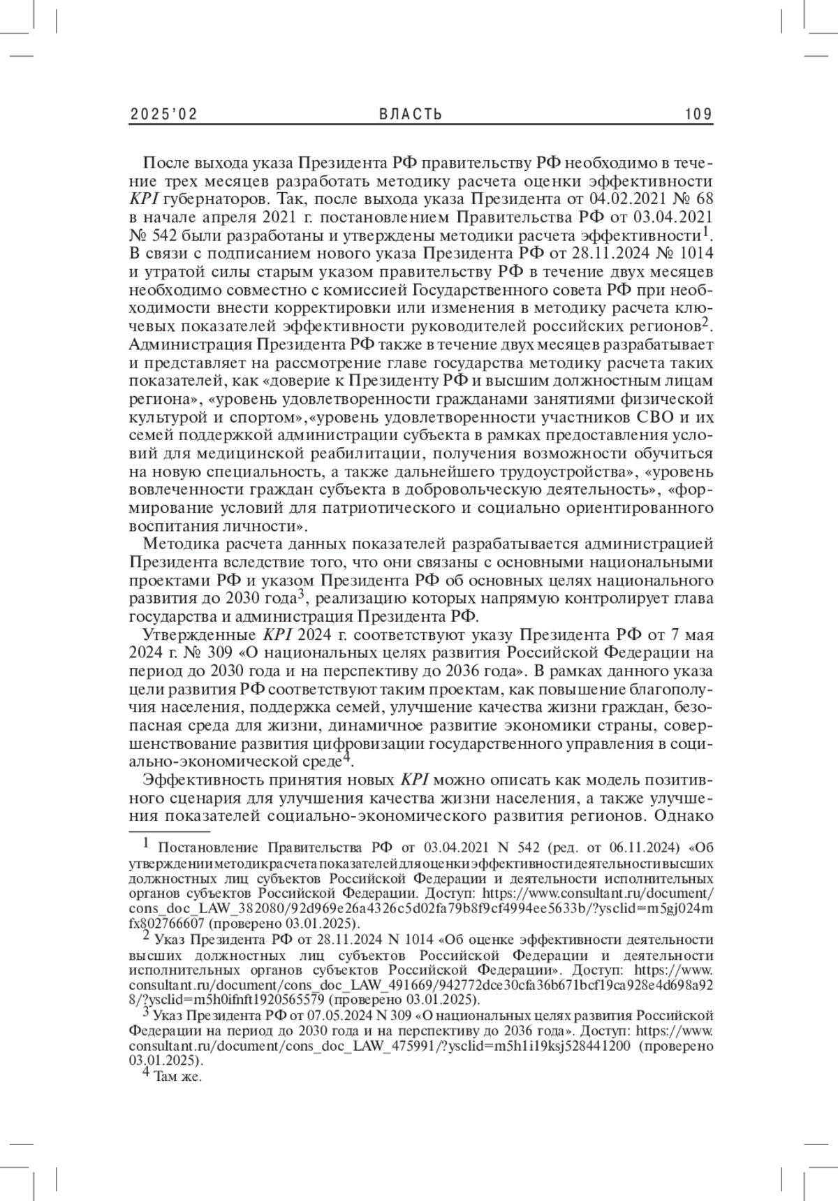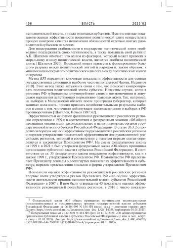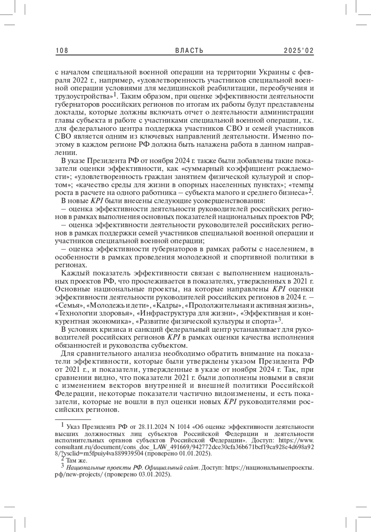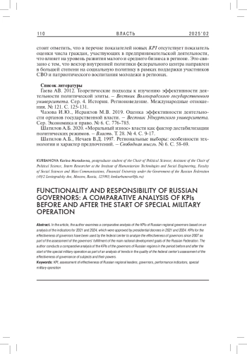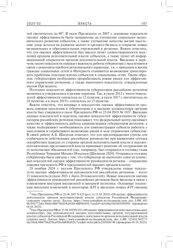 В статье автор рассматривает сравнительный анализ KPI губернаторов российских регионов на основе анализа показателей 2021 и 2024 года, которые были утверждены указами Президента РФ в 2021 и 2024 гг. KPI эффективности губернаторов применяются федеральным центром для анализа эффективности губернаторов с 2007 г. в рамках оценки выполнения губернаторами основных национальных целей развития Российской Федерации. Автор проводит сравнительный анализ KPI губернаторов российских регионов в период до начала специальной военной операции и после в рамках анализа тенденций изменения качества оценки федеральным центром эффективности управления субъектами и их полномочий.