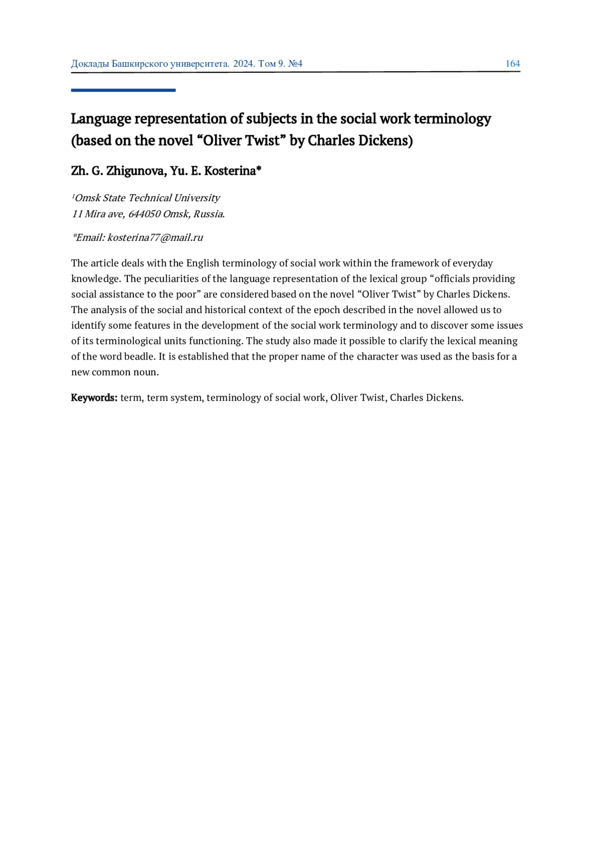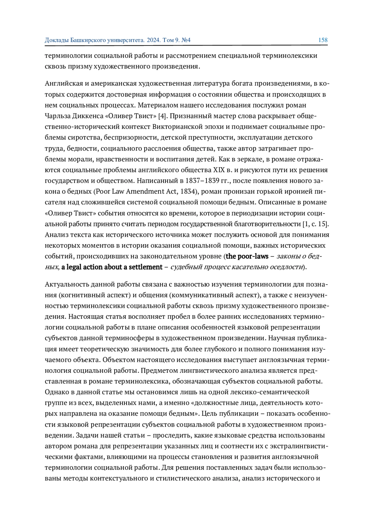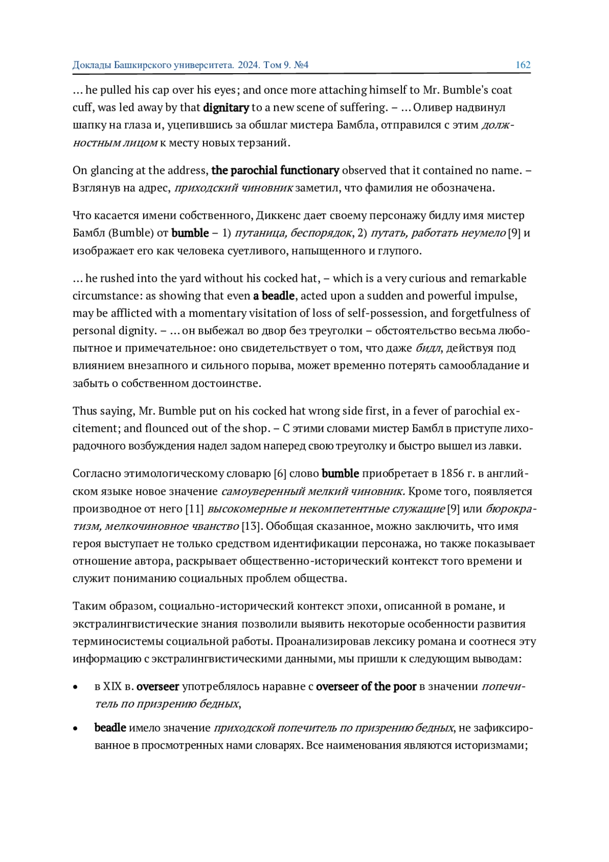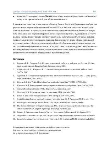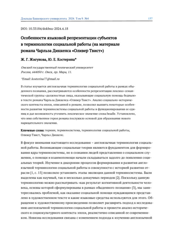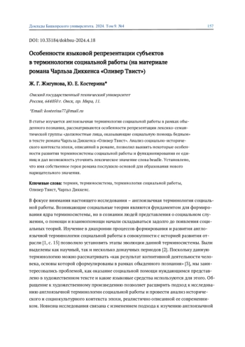 В статье изучается англоязычная терминология социальной работы в рамках обыденного познания, рассматриваются особенности репрезентации лексико-семантической группы «должностные лица, оказывающие социальную помощь бедным» в тексте романа Чарльза Диккенса «Оливер Твист». Анализ социально-исторического контекста эпохи, описанной в романе, позволил выявить некоторые особенности развития терминосистемы социальной работы и функционирования ее единиц и дал возможность уточнить лексическое значение слова beadle. Установлено, что имя собственное героя романа послужило основой для образования нового нарицательного значения.