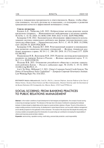 В современных условиях стремительного развития технологий и цифровизации концепция социального скоринга приобретает все большую значимость. Актуальность темы заключается в изучении способов оценки индивидуального поведения граждан на основе цифровых данных и его влияния на социально-трудовые отношения в России. Цель данной статьи - проанализировать существующие практики социального скоринга, его развитие в сферах, выходящих за рамки финансов, таких как управление общественными отношениями, и выявить перспективы применения этого механизма. Результаты исследования показывают, что, несмотря на существующие риски нарушения приватности и возможные злоупотребления, внедрение социального рейтинга может способствовать повышению ответственности граждан и улучшению социально-трудовых отношений.