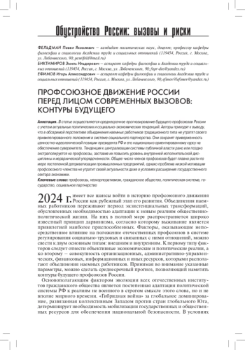 2024 г. имеет все шансы войти в историю профсоюзного движения России как рубежный этап его развития. Объединения наемных работников переживают период экзистенциальных трансформаций, обусловленных необходимостью адаптации к новым реалиям общественно-политической жизни.