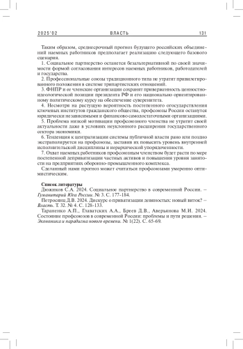 1. 	Дюжиков С.А. 2024. Социальное партнерство в современной России. - Гуманитарий Юга России. № 3. С. 177-184. EDN: UDCIFH