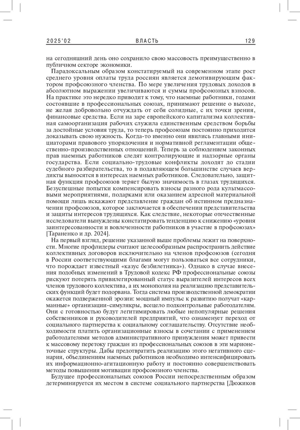 3. 	Тараненко А.П., Главатских А.А., Бреев Д.В., Аверьянова М.И. 2024. Состояние профсоюзов в современной России: проблемы и пути решения. - Экономика и парадигма нового времени. № 1(22). С. 65-69. EDN: IOMUFK