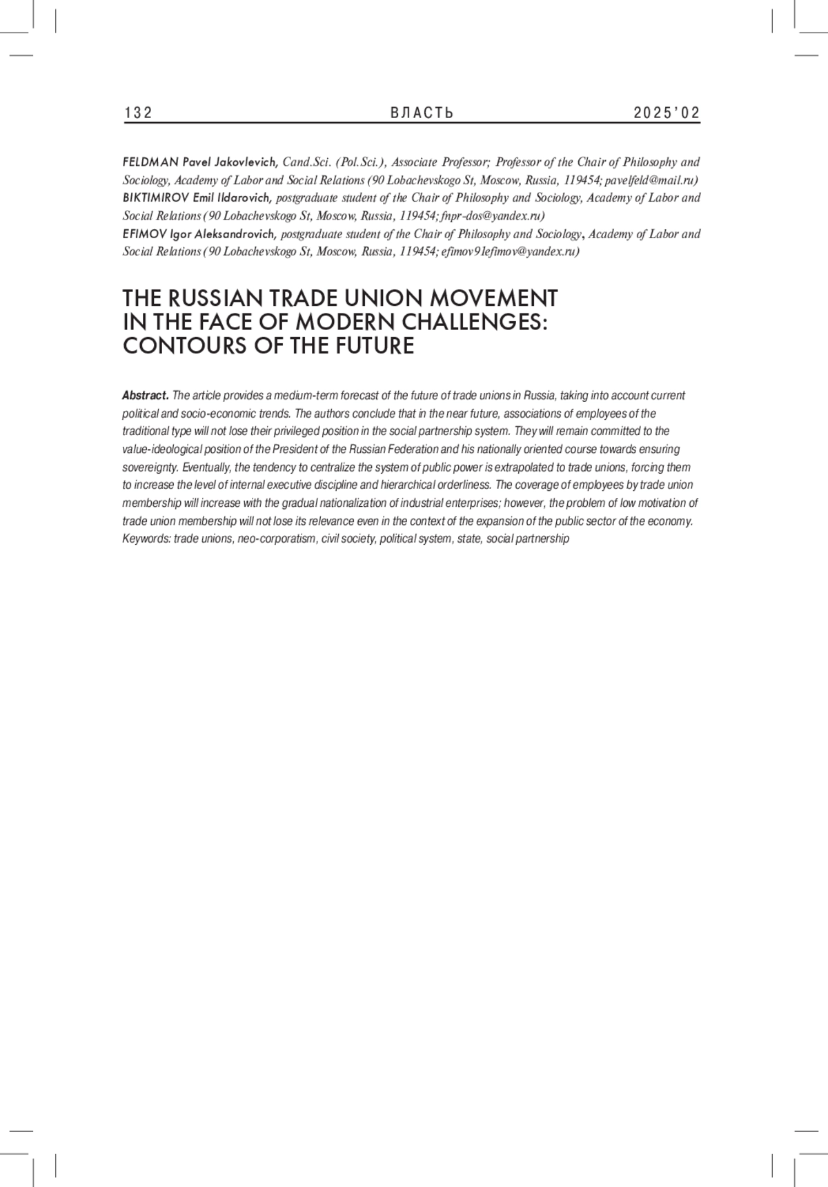 В статье осуществляется среднесрочное прогнозирование будущего профсоюзов России с учетом актуальных политических и социально-экономических тенденций. Авторы приходят к выводу, что в обозримой перспективе объединения наемных работников традиционного типа не утратят своего привилегированного положения в системе социального партнерства. Они сохранят приверженность ценностно-идеологической позиции президента РФ и его национально ориентированному курсу на обеспечение суверенитета. Тенденция к централизации системы публичной власти рано или поздно экстраполируется на профсоюзы, заставив их повысить уровень внутренней исполнительской дисциплины и иерархической упорядоченности. Общее число членов профсоюзов будет плавно расти по мере постепенной деприватизации промышленных предприятий, однако проблема низкой мотивации профсоюзного членства не утратит своей актуальности даже в условиях расширения государственного сектора экономики.