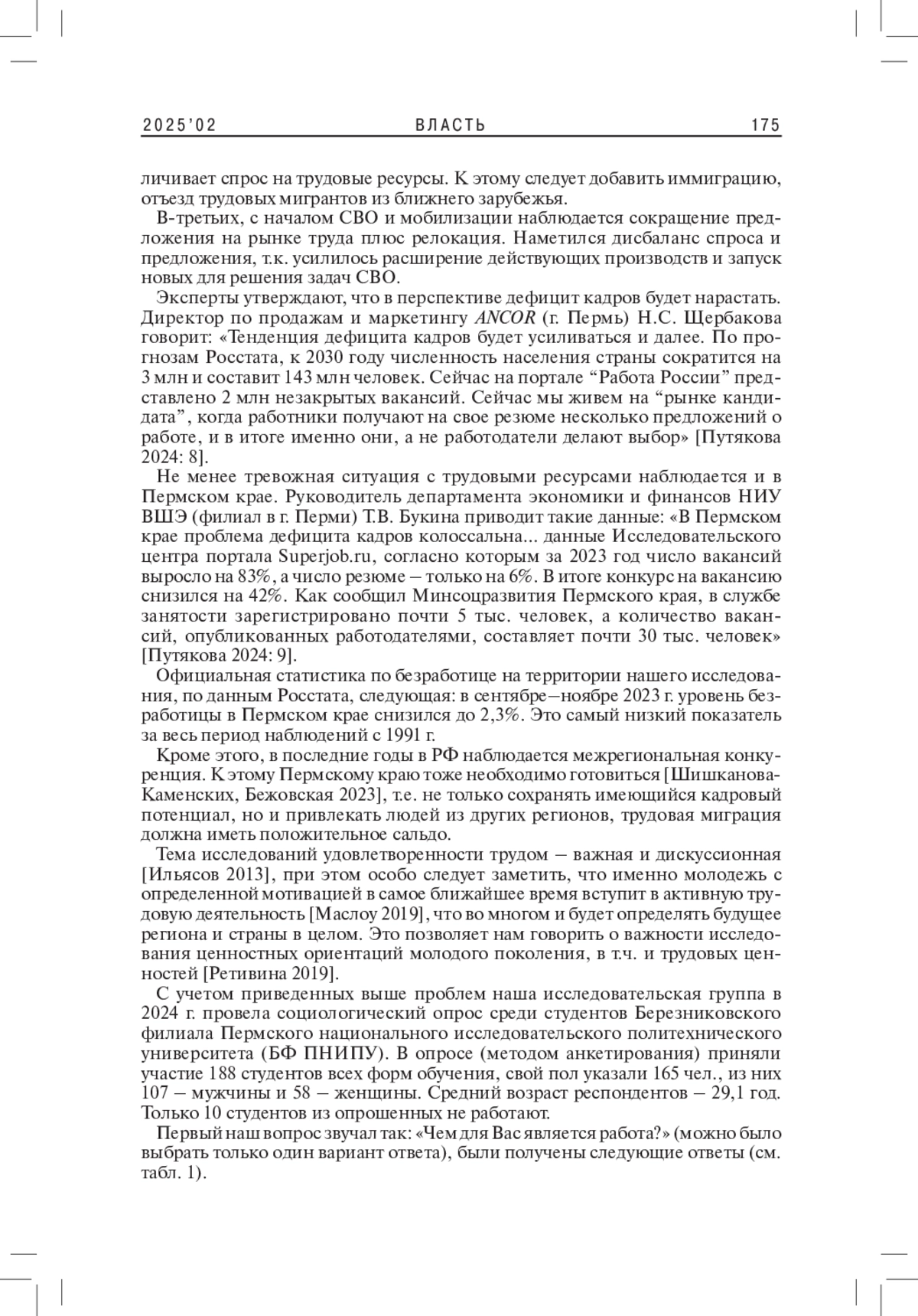 14. 	Путякова П. 2024. Кадровый переучет. Как дефицит рабочей силы тормозит экономический рост. - Новый компаньон (Пермь). № 2(1126). 6 февраля 2024. С. 8-9.