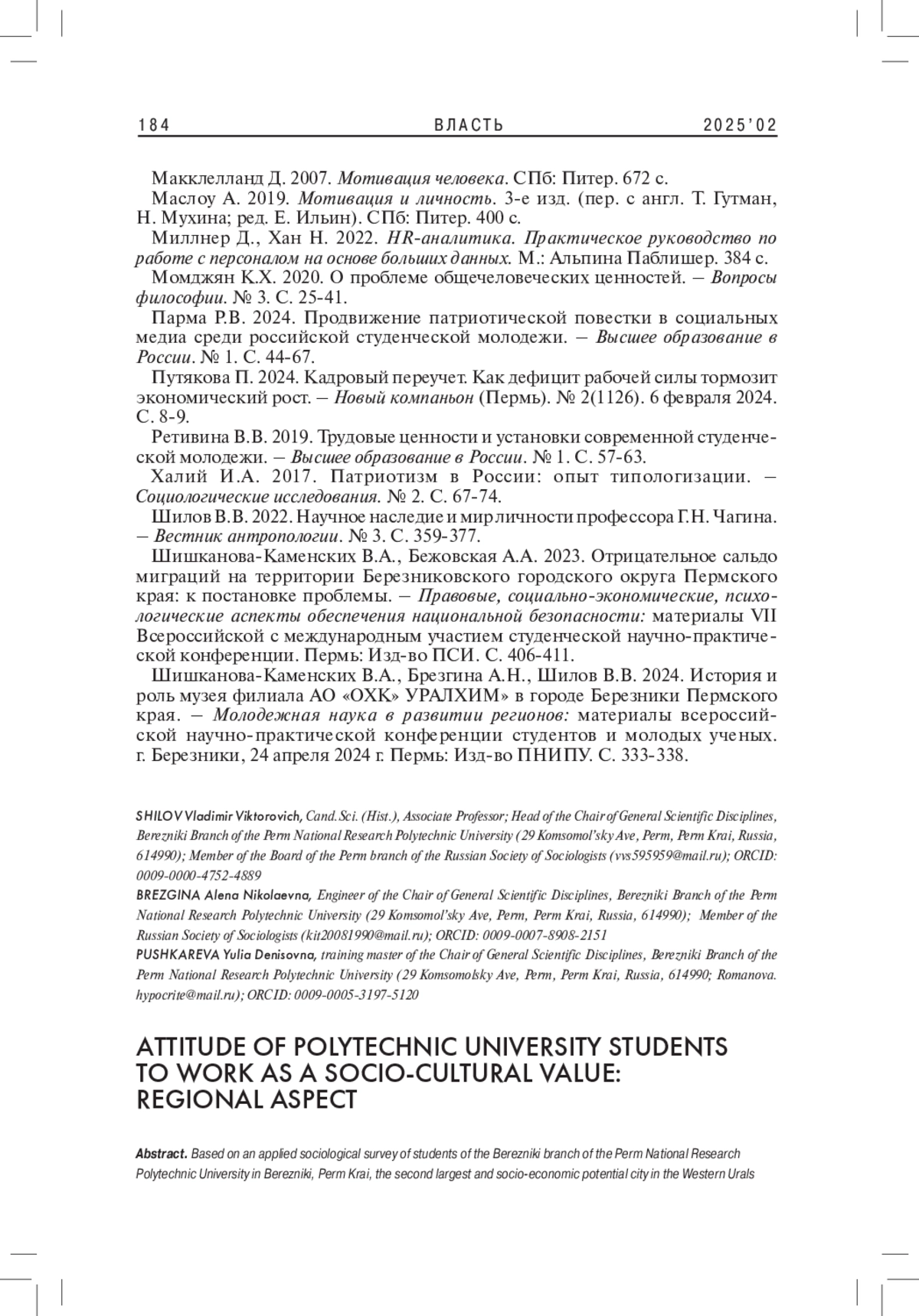 15. 	Ретивина В.В. 2019. Трудовые ценности и установки современной студенческой молодежи. - Высшее образование в России. № 1. С. 57-63. EDN: YURZVB