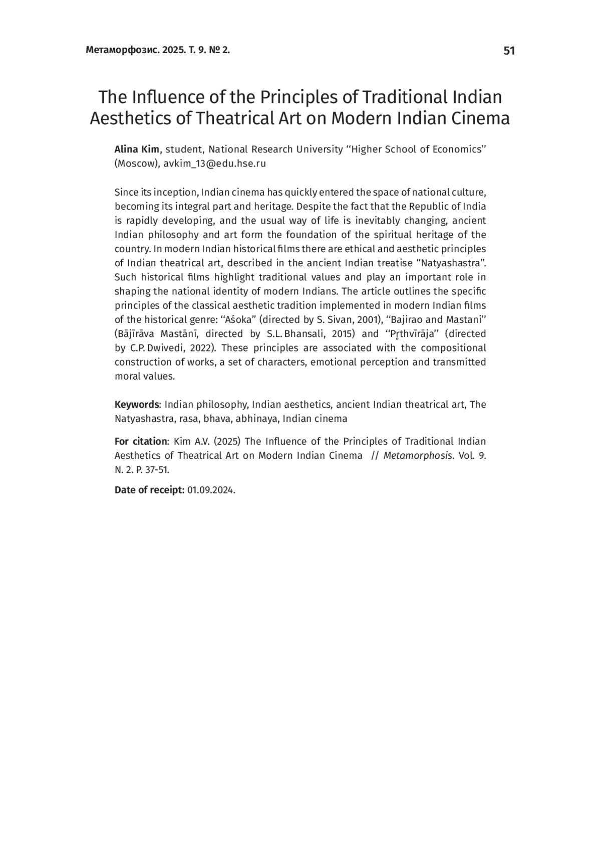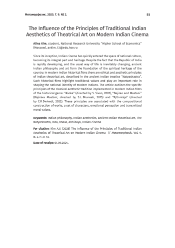 С момента своего появления индийский кинематограф плотно проник в пространство национальной культуры, став ее неотъемлемой частью и достоянием. Несмотря на то, что Республика Индия быстро развивается и неизбежно меняется привычный уклад жизни, древнеиндийские памятники философии и искусства составляют фундамент духовного наследия страны. Например, в современных индийских фильмах исторического жанра проявляются этико-эстетические принципы древнеиндийского театрального искусства, описанные в древнеиндийском трактате «Натьяшастра». Исторические фильмы становятся трансляторами традиционных ценностей и играют большую роль в формировании национального самосознания современных индийцев. В статье рассматриваются конкретные принципы классической эстетической традиции, связанные с композиционным построением произведений, набором персонажей, эмоциональным восприятием и нравственными ценностями. Они реализуются в таких фильмах, как «Ашока» («Aśoka», реж. С. Сиван, 2001), «Баджирао и Мастани» («Bājīrāva Mastānī», реж. С. Л. Бхансали, 2015) и «Притхвирадж» (Pr̥thvīrāja, реж. Ч. П. Двиведи, 2022).