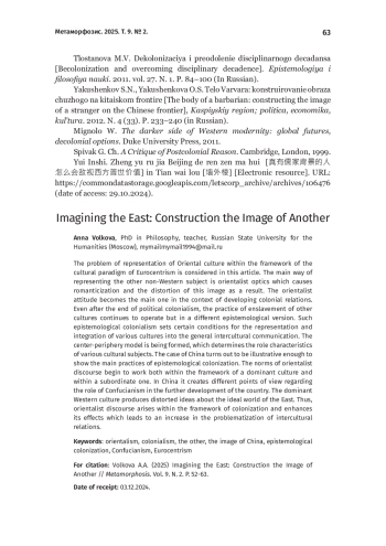В данной статье рассматривается проблема представления восточной культуры в рамках европоцентристской культурной парадигмы. Основным способом представления другого, не западного субъекта, становится ориенталистская оптика, которая обуславливает романтизацию, а как следствие, искажение этого образа. Ориенталистская установка становится основной в условиях развивающихся колониальных отношений. Даже после окончания политического колониализма практики подчинения других культур продолжают работать, но уже в ином – эпистемологическом варианте. Такой эпистемологический колониализм задает определенные условия для представления и встраивания в общую межкультурную коммуникацию различных культур. Формируется модель цент-периферия, которая определяет ролевые особенности различных культурных субъектов. Случай Китая оказывается достаточно иллюстративным для того, чтобы показать основные практики эпистемологической колонизации. Нормы ориенталистского дискурса начинают работать как в рамках доминантной культуры, так и в пределах подчиненной. Внутри Китая они создают различные точки зрения относительно роли конфуцианства в дальнейшем развитии страны. Доминантная западная культура производит искаженные представления об идеальном мире Востока. Таким образом, ориенталистский дискурс возникает в рамках колонизации и усиливает ее эффекты, что приводит к нарастанию проблематизации межкультурных отношений.