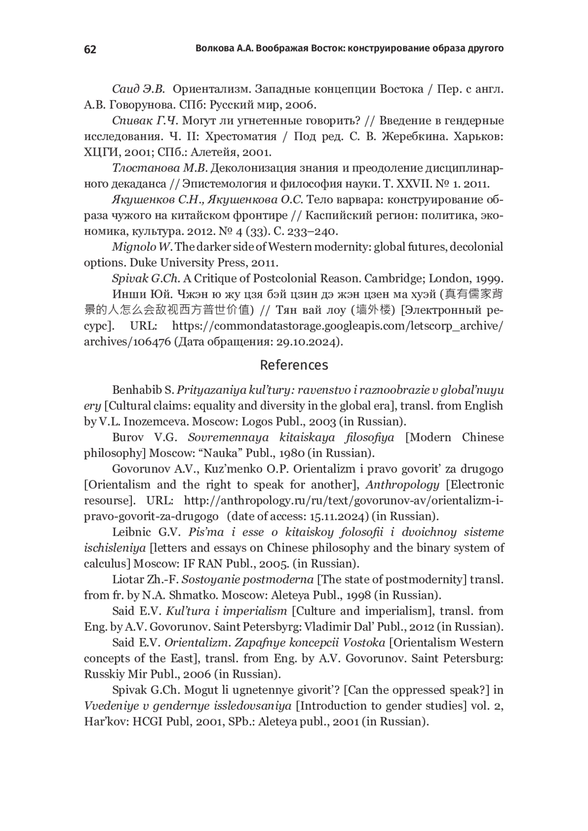 7. 	Саид Э.В. Ориентализм. Западные концепции Востока / Пер. с англ. А.В. Говорунова. СПб: Русский мир, 2006. EDN: VWMXID