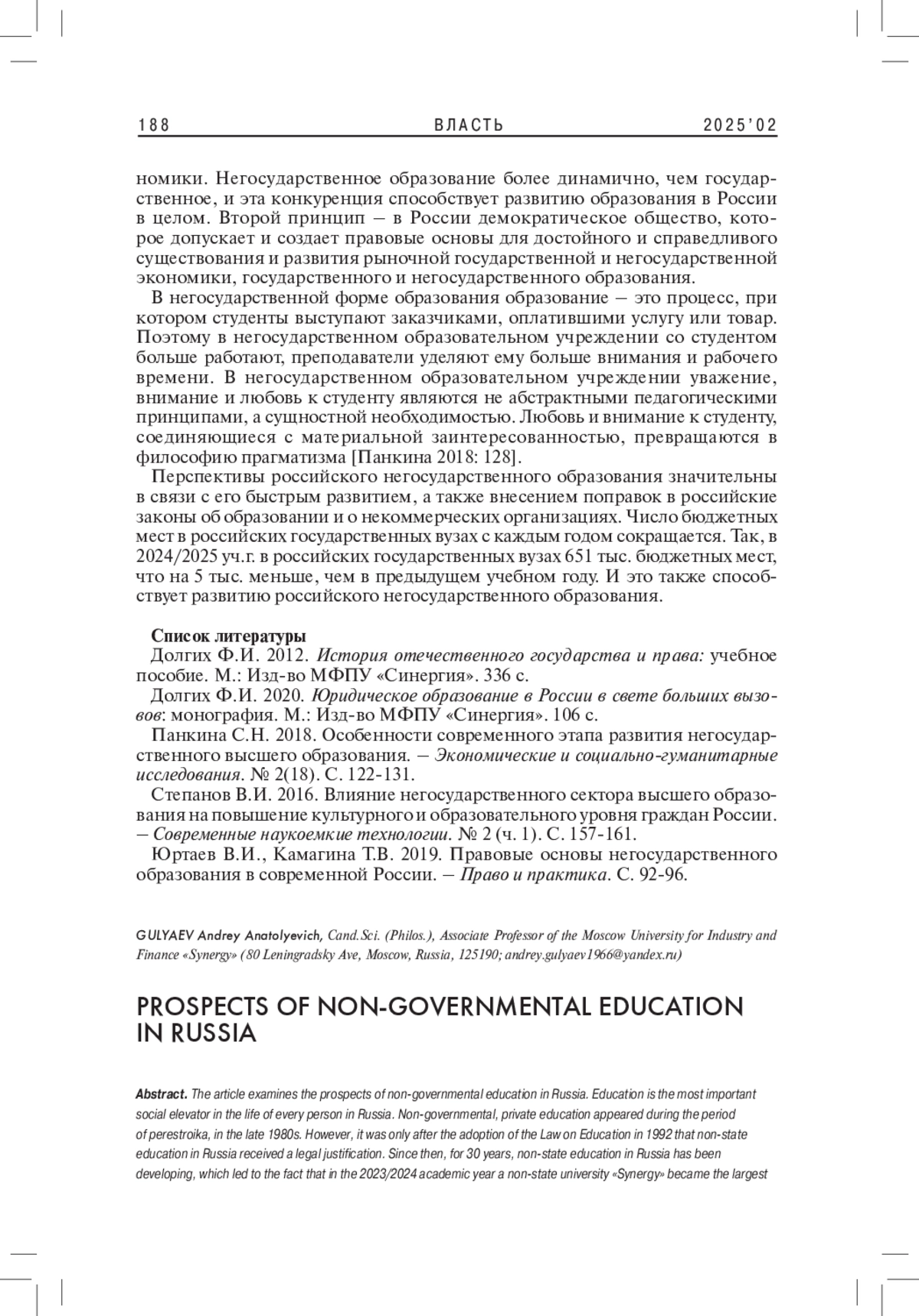 4. 	Степанов В.И. 2016. Влияние негосударственного сектора высшего образования на повышение культурного и образовательного уровня граждан России. - Современные наукоемкие технологии. № 2 (ч. 1). С. 157-161. EDN: VMGLWR