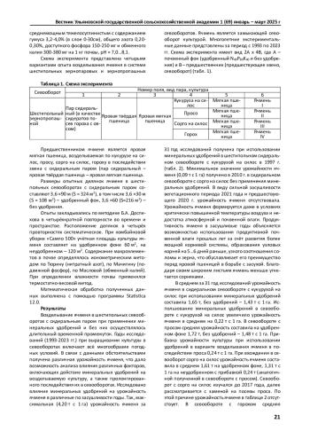 В условиях производства все большее распространение получает технология прямого посева (No-till), которая призвана решить задачи по снижению себестоимости продукции, защиты почв от эрозии, и особенно она актуальна в условиях недостатка продуктивной влаги. Цель исследований: изучить влияние технологии прямого посева при разных нормах внесения минеральных удобрений и использования промежуточных культур на накопление продуктивной влаги и ее использование на формирование урожайности сои в условиях лесостепной зоны Среднего Поволжья. Исследования проводили на опытном поле в многофакторном полевом опыте, соя размещалась в севообороте: яровой рапс - озимая пшеница - соя - яровая пшеница - гречиха - ячмень. Все культуры возделывали по технологии прямого посева на трех вариантах удобрений (фактор А), под сою применяли следующие нормы: А0 - без удобрений (контроль); А1 - N6P15K23S2; А2 - N13P3oK46S5. После уборки зерновых культур в севообороте производился посев промежуточных культур на сидераты (Фактор В): В0 - без почвопокровных культур (контроль); В1 -смесь яровых культур; В2 - смесь озимых культур. Внесение удобрений при посеве снижали коэффициент водопотребления (Кв) сои на 355…398 м3/т и повышали ее урожайность на 0,32…0,44 т/га или 20,6.28,4 % с окупаемостью урожая 4,68.6,81 кг/кг д. в. Промежуточные культуры в севообороте обеспечили формирование больших запасов продуктивной влаги в почве благодаря накоплению снега в зимний период, проектного покрытия и снижения потерь на физическое испарение, что положительно сказалось на урожайности сои. Достоверная прибавка по отношению к контролю выявлена после смеси озимых промежуточных культур - 0,24 т/га или 8,6 %.