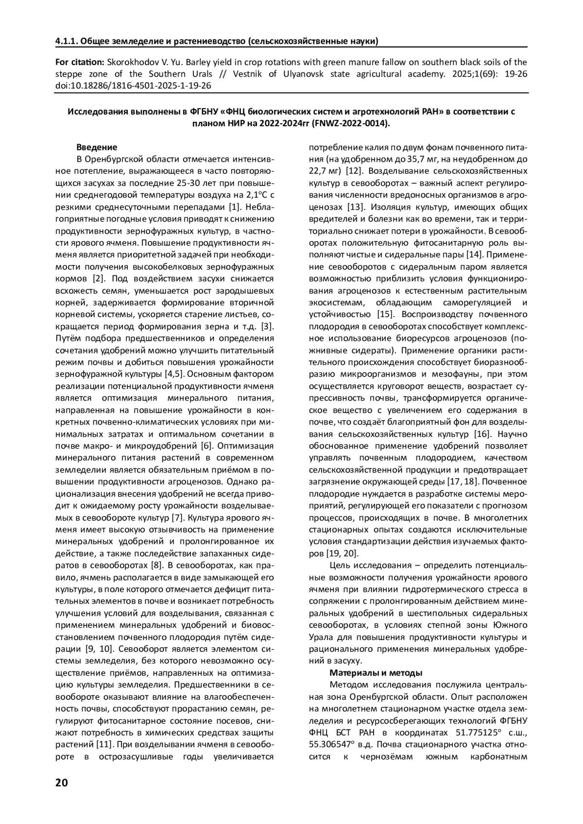 8. Скороходов В. Ю. Урожайность ячменя в шестипольных севооборотах на чернозёмах южных степной зоны Южного Урала // Известия Оренбургского государственного аграрного университета. 2019. №5 (79). С. 93-97. EDN: FUYDOV