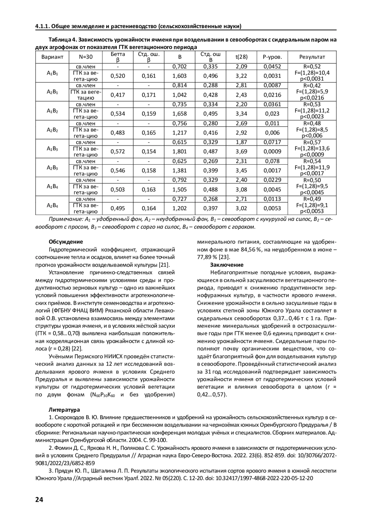 23. Пасынков А. В., Пасынкова Е. Н. Урожайность зерна ячменя и её зависимость от минерального питания и гидротермических условий в период вегетации //Агрохимический вестник. 2019. №2. С. 33-38. EDN: LEECJX