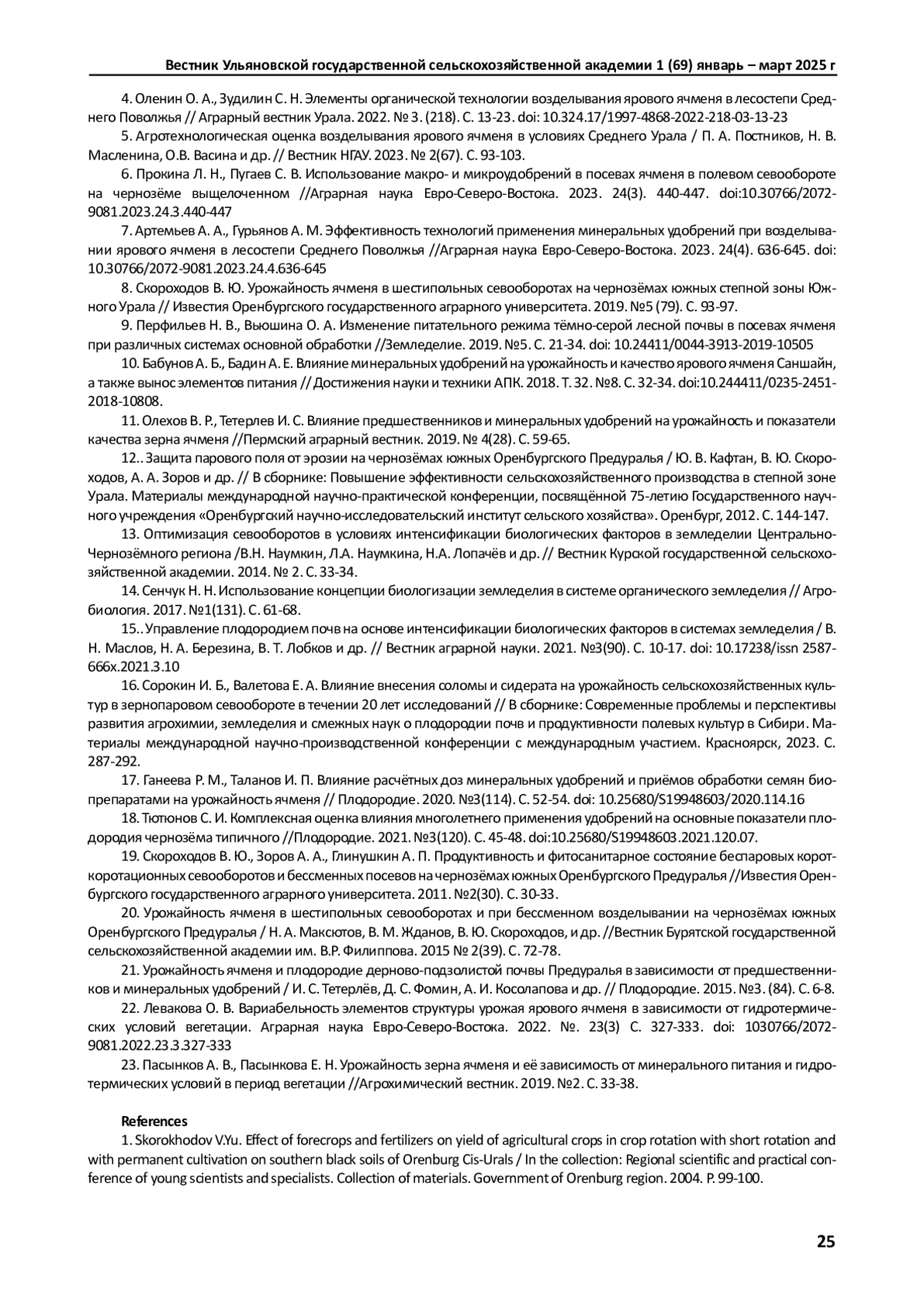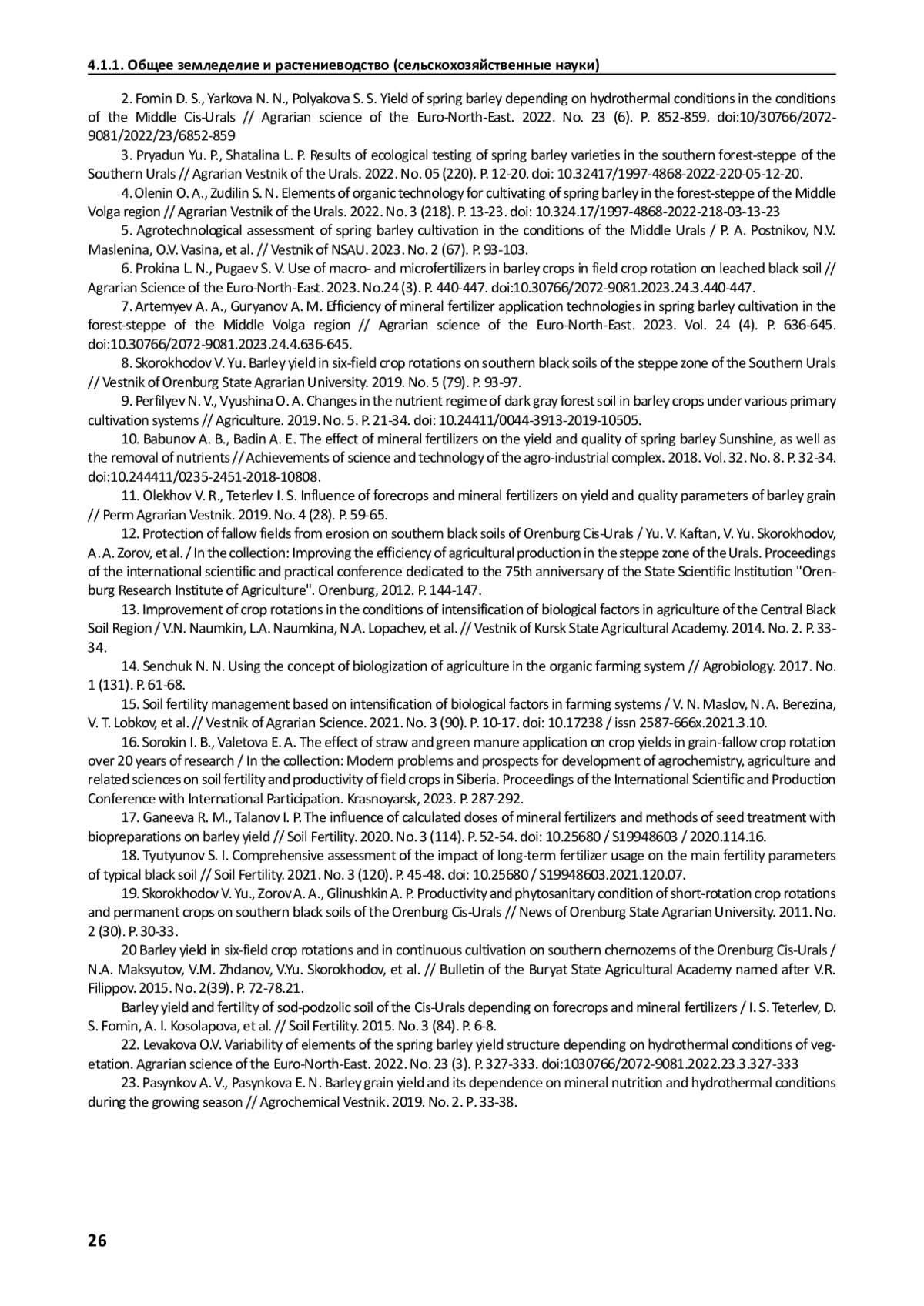 7. Артемьев А. А., Гурьянов А. М. Эффективность технологий применения минеральных удобрений при возделывании ярового ячменя в лесостепи Среднего Поволжья //Аграрная наука Евро-Северо-Востока. 2023. 24(4). 636-645. DOI: 10.30766/2072-9081.2023.24.4.636-645 EDN: CPTTOK